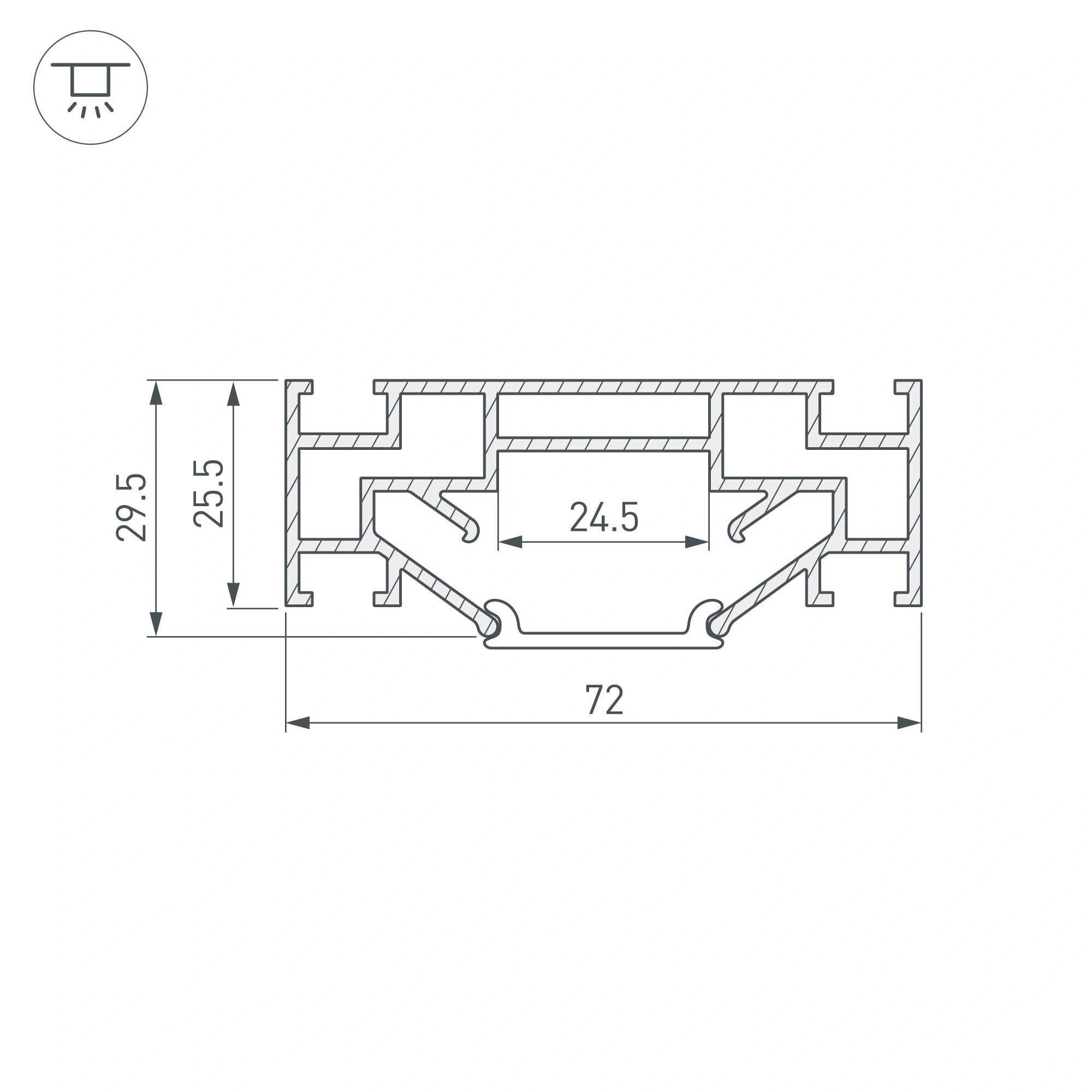 Встраиваемый алюминиевый профиль (центральная линия) для дизайнерских решений «линии света» в натяжных потолках. Решение 2-в-1: служит каркасом для крепления натяжного потолка и профилем для установки светодиодной ленты. Габаритные размеры профиля составляют 2000 мм в длину, 72 мм в ширину и 29,5 мм в высоту. Площадка для установки светодиодных лент позволяет использовать ленту шириной до 24,5 мм и мощностью до 53 Вт/м. Это обеспечивает гибкость в выборе светодиодных лент и создает потрясающие световые решения. Экран, заглушки и другие аксессуары не включены в комплект и приобретаются отдельно. Цена указана за 1 метр профиля. Отличное решение для создания современных световых проектов.