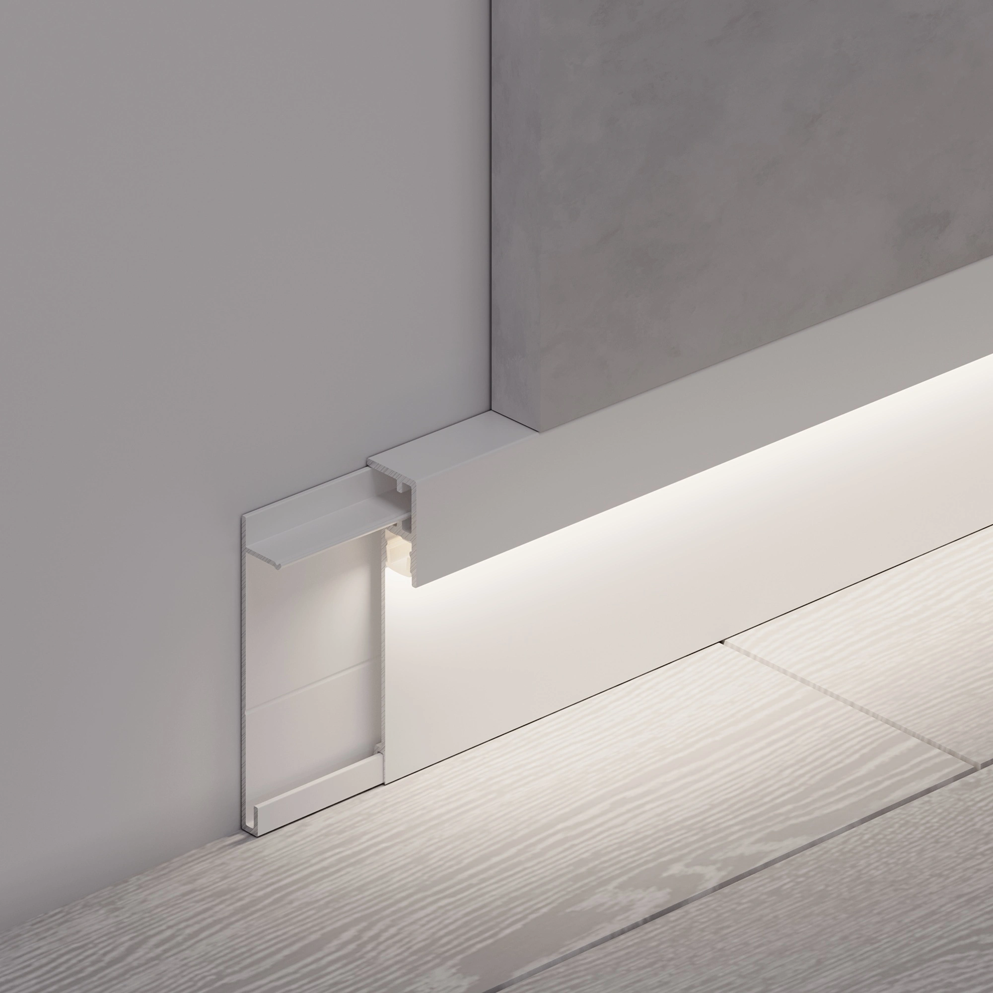 Алюминиевый накладной двухкомпонентный профиль-плинтус для светодиодных лент и линеек. Цвет - белый RAL9003 (порошковая окраска). Габаритные размеры (L×W×H): 2000x12,3x52,6мм. Ширина площадки для ленты 5 мм. Аксессуары приобретаются отдельно. Цена за метр.