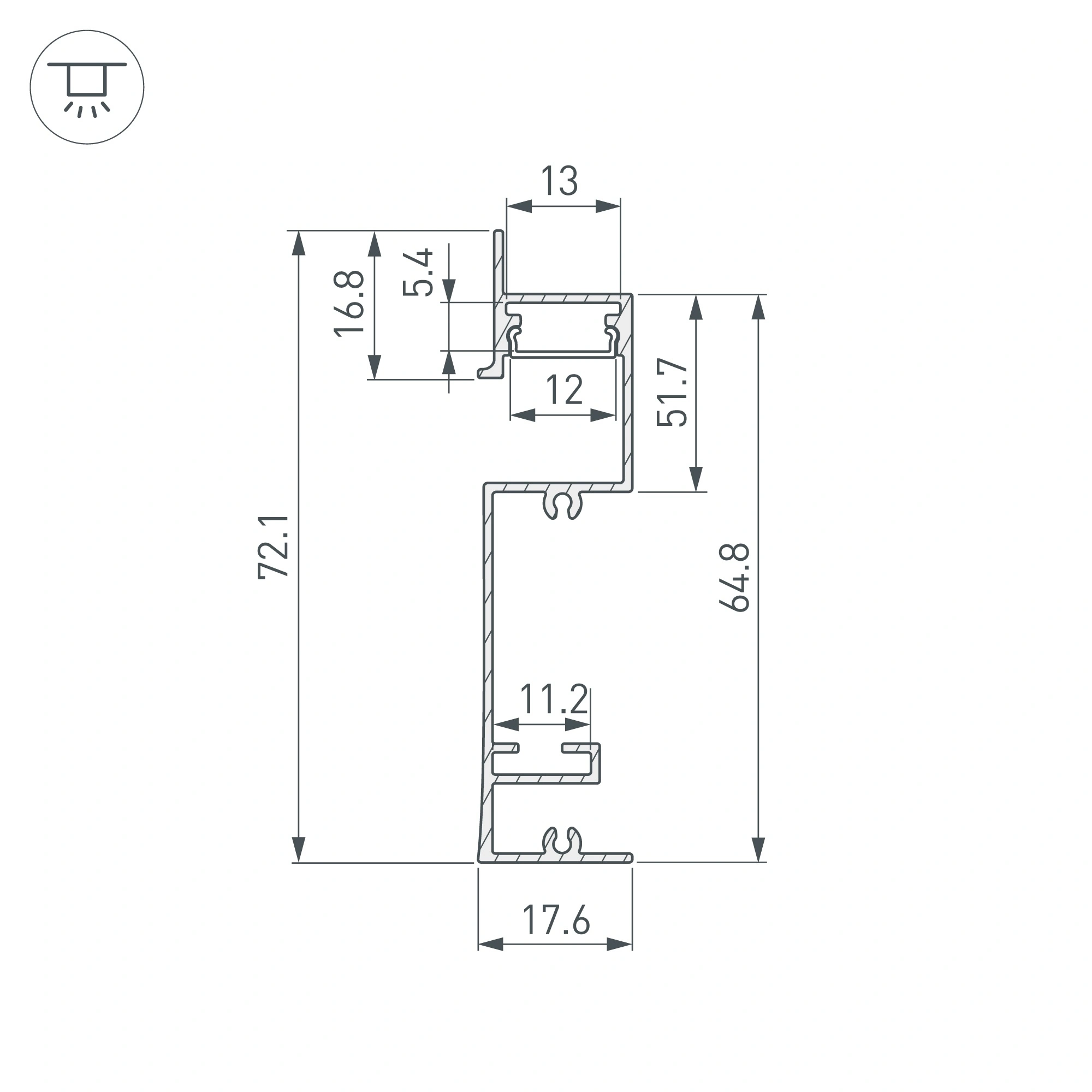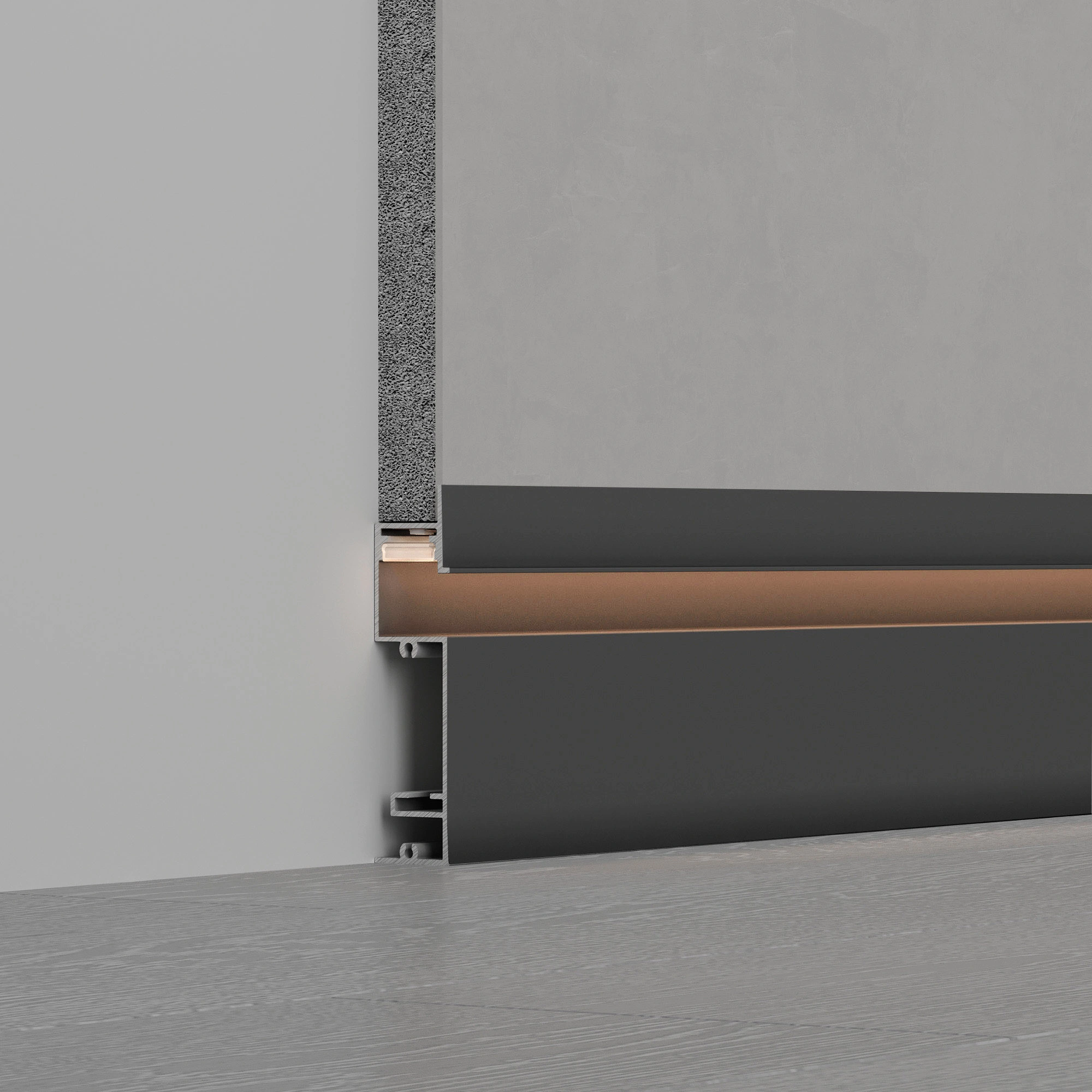Встраиваемый алюминиевый профиль-плинтус с накладным фланцем черного цвета для создания эффекта парящей стены. Габаритные размеры этого профиля составляют 2000 мм в длину, 17,6 мм в ширину и 72,1 мм в высоту. Площадка для установки светодиодных лент позволяет использовать ленту шириной до 12 мм и мощностью до 32 Вт/м. Это обеспечивает гибкость в выборе светодиодных лент и создает потрясающие световые решения. Экран, заглушки и другие аксессуары не включены в комплект и приобретаются отдельно. Цена указана за 1 метр профиля. Отличное решение для создания современных световых проектов.