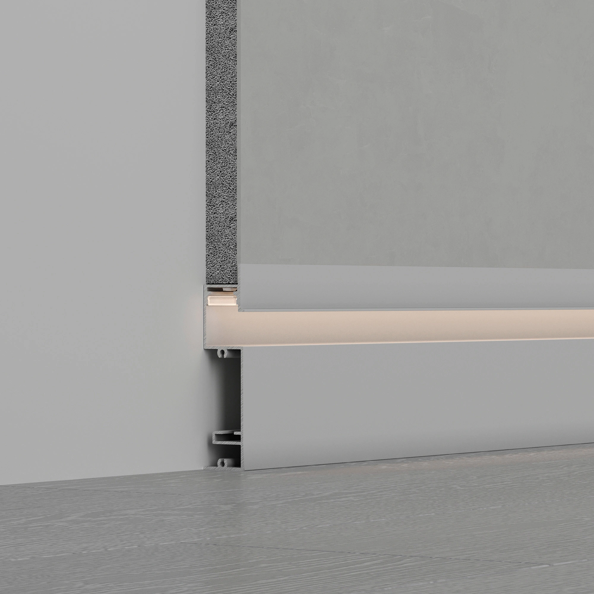 Встраиваемый алюминиевый профиль-плинтус с накладным фланцем белого цвета для создания эффекта парящей стены. Габаритные размеры этого профиля составляют 2000 мм в длину, 17,6 мм в ширину и 72,1 мм в высоту. Площадка для установки светодиодных лент позволяет использовать ленту шириной до 12 мм и мощностью до 32 Вт/м. Это обеспечивает гибкость в выборе светодиодных лент и создает потрясающие световые решения. Экран, заглушки и другие аксессуары не включены в комплект и приобретаются отдельно. Цена указана за 1 метр профиля. Отличное решение для создания современных световых проектов.