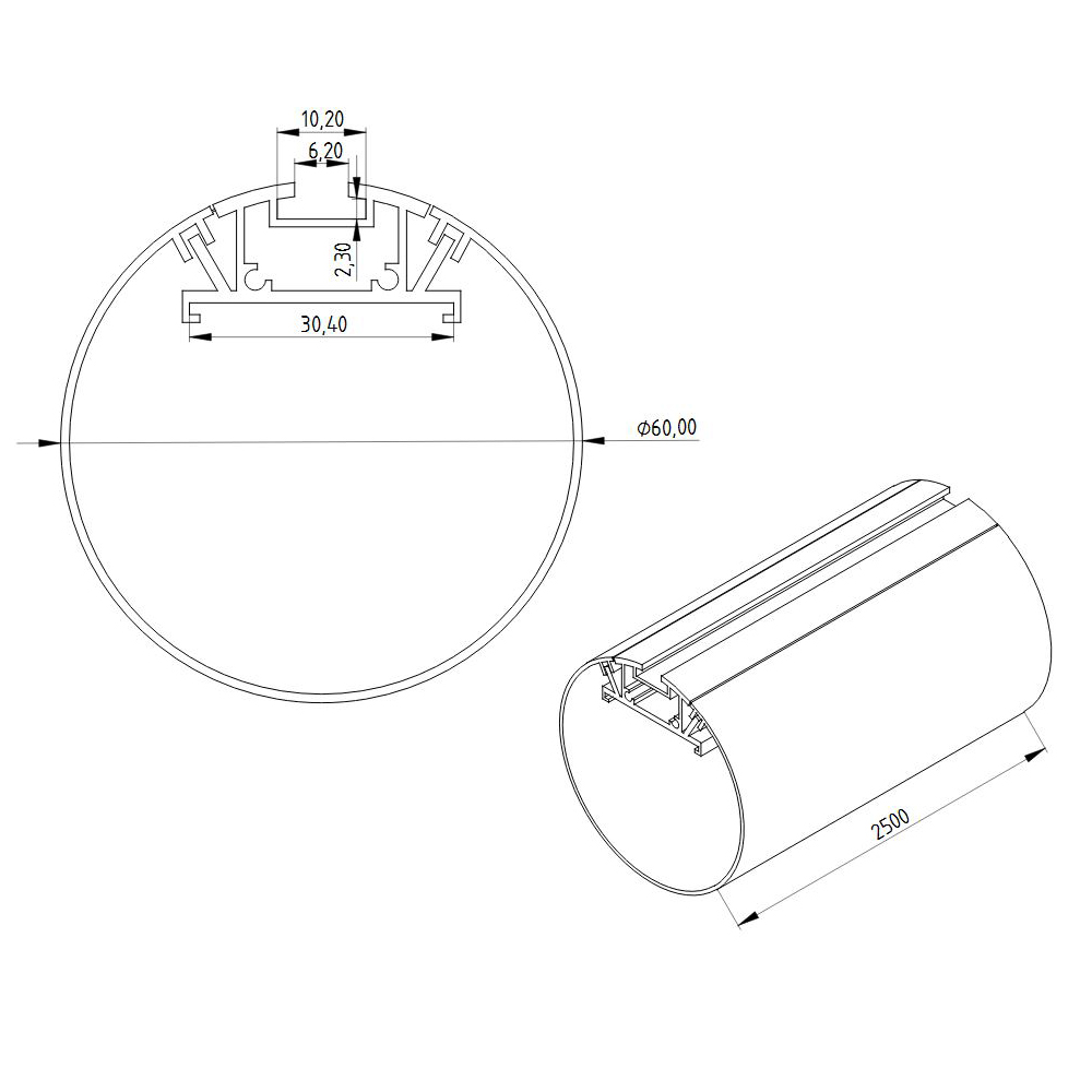 Цена указана за комплект. Алюминиевый анодированный круглый профиль. Размеры 2500х60мм. Вес 1350г. В комплекте с матовым рассеивателем.