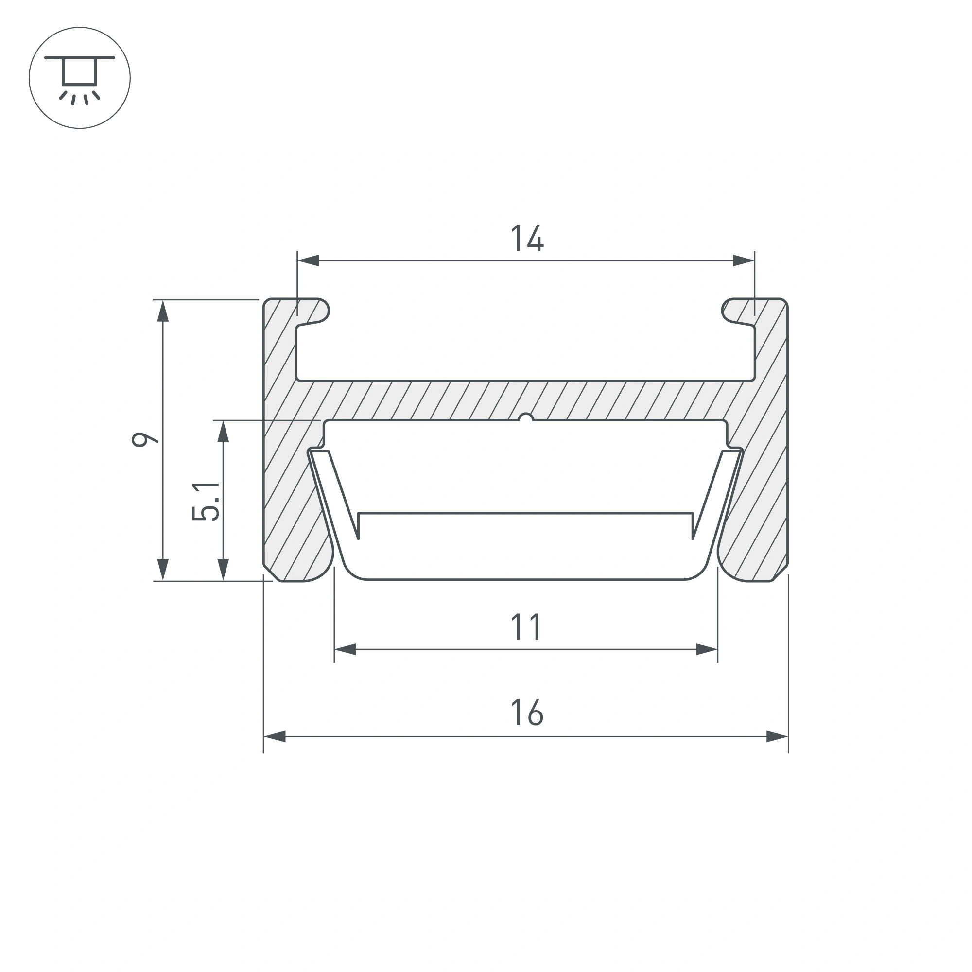Алюминиевый анодированный профиль для светодиодных лент и линеек, со скрытым монтажом на скобы. Габаритные размеры (L×W×H): 2000x16x9 мм. Ширина площадки для ленты 11 мм. Экраны, заглушки и другие аксессуары приобретаются отдельно. Цена за 1 метр.
