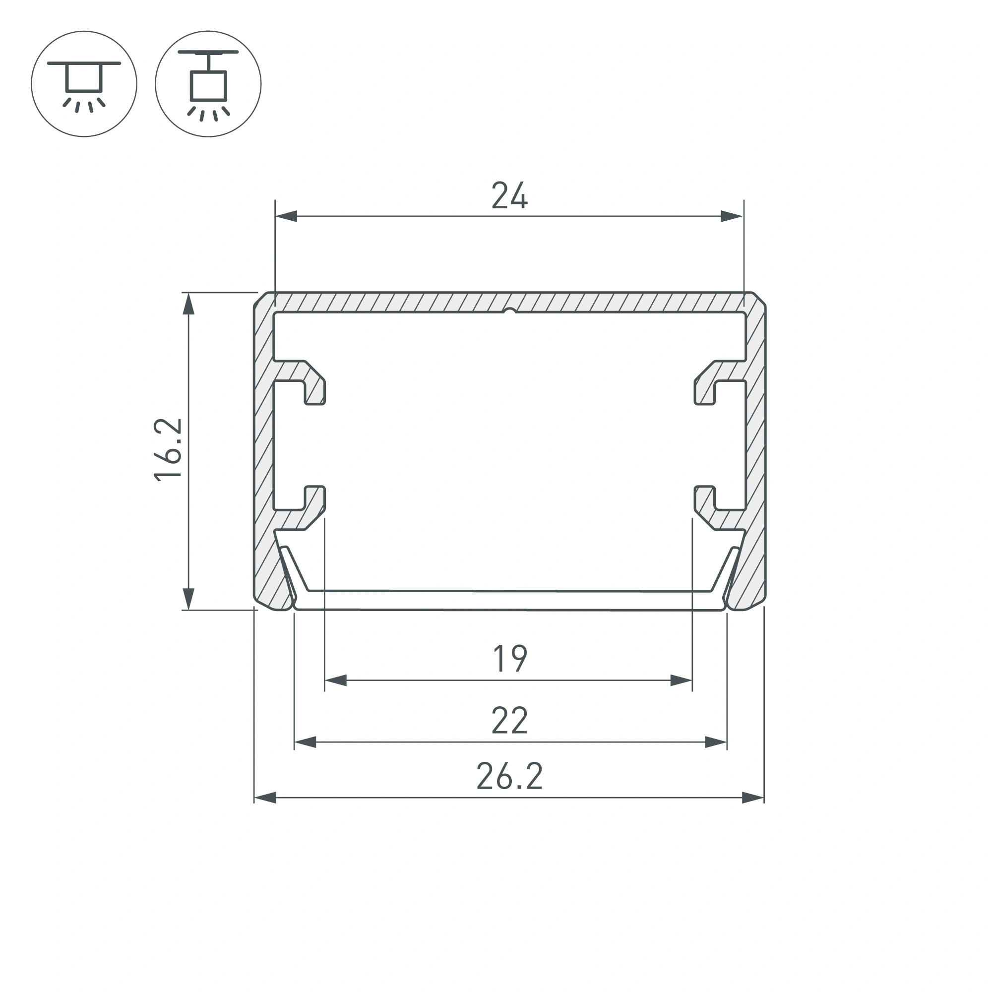 Накладной/подвесной/встраиваемый профиль черного цвета из анодированного алюминия для основного освещения и контурной подсветки. Габаритные размеры профиля составляют 2000 мм в длину, 26,2 мм в ширину и 16,2 мм в высоту. Площадка для установки светодиодных лент позволяет использовать ленту шириной до 24 мм и мощностью до 21,8 Вт/м. Это обеспечивает гибкость в выборе светодиодных лент и создает потрясающие световые решения. Экраны, заглушки и другие аксессуары не включены в комплект и приобретаются отдельно. Цена указана за 1 метр профиля. Отличное решение для создания современных световых проектов.
