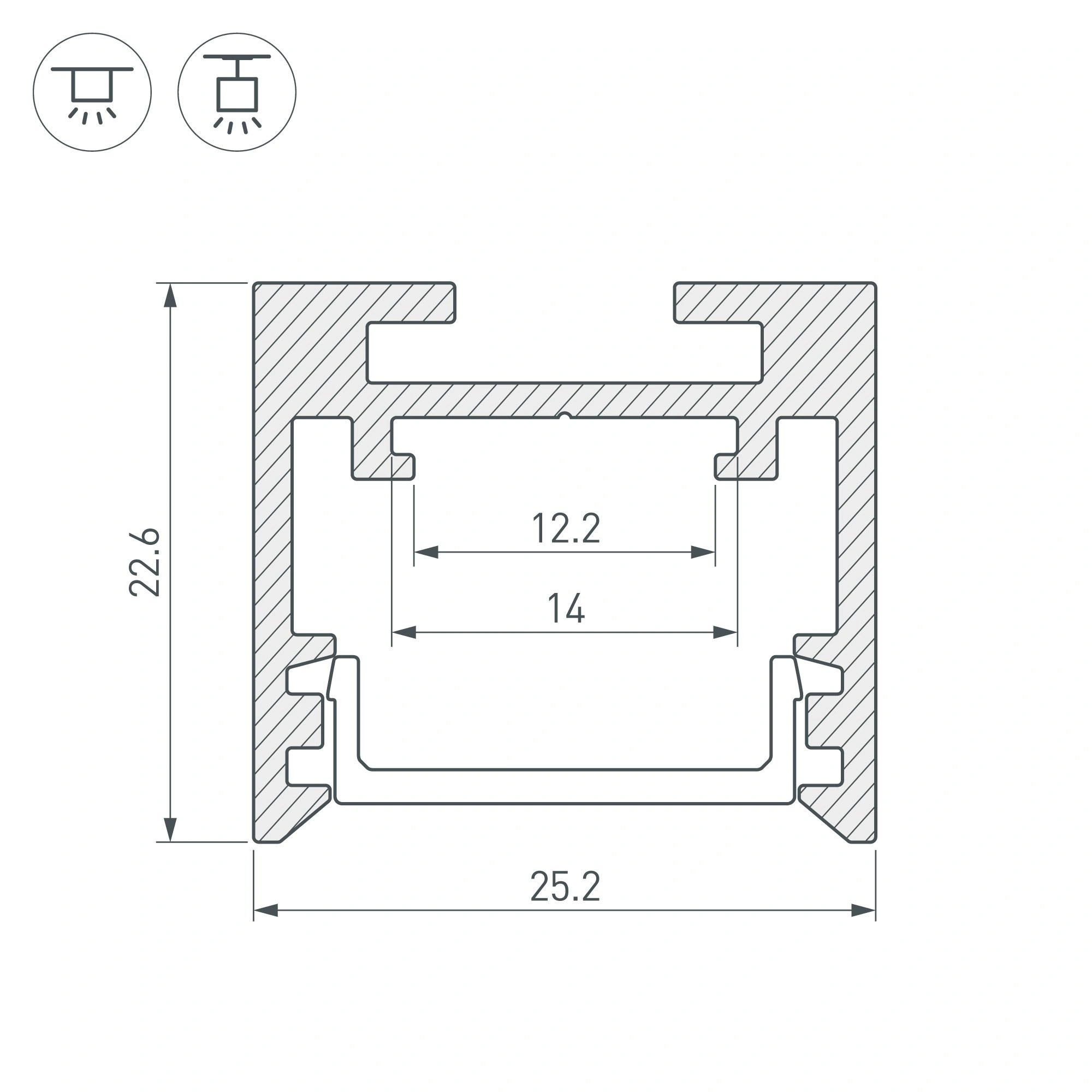 Подвесной/накладной профиль черного цвета из алюминия для основного освещения и контурной подсветки. Габаритные размеры профиля составляют 2500 мм в длину, 25 мм в ширину и 22 мм в высоту. Площадки для установки светодиодных лент позволяют использовать ленты шириной до 12 мм и мощностью до 25 Вт/м. Это обеспечивает гибкость в выборе светодиодных лент и создает потрясающие световые решения. Экраны, заглушки и другие аксессуары не включены в комплект и приобретаются отдельно. Цена указана за 1 метр профиля. Отличное решение для создания современных световых проектов.