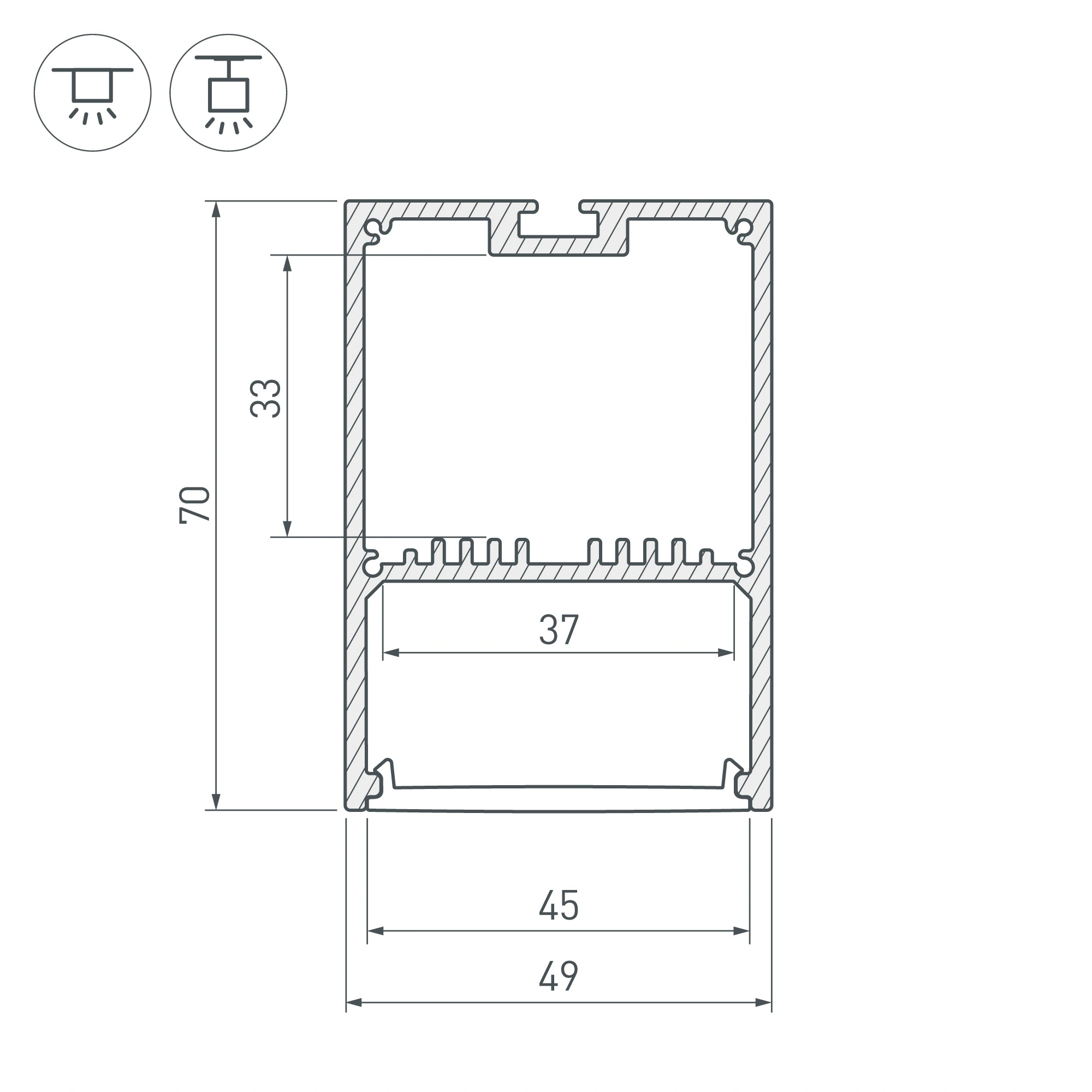 Алюминиевый анодированный профиль для светодиодных лент и линеек. Габаритные размеры (L×W×H): 2500x49x70 мм. Ширина площадки для ленты 37 мм. Отсек для БП 33х45мм. Экраны, заглушки и другие аксессуары приобретаются отдельно. Цена за 1 метр.