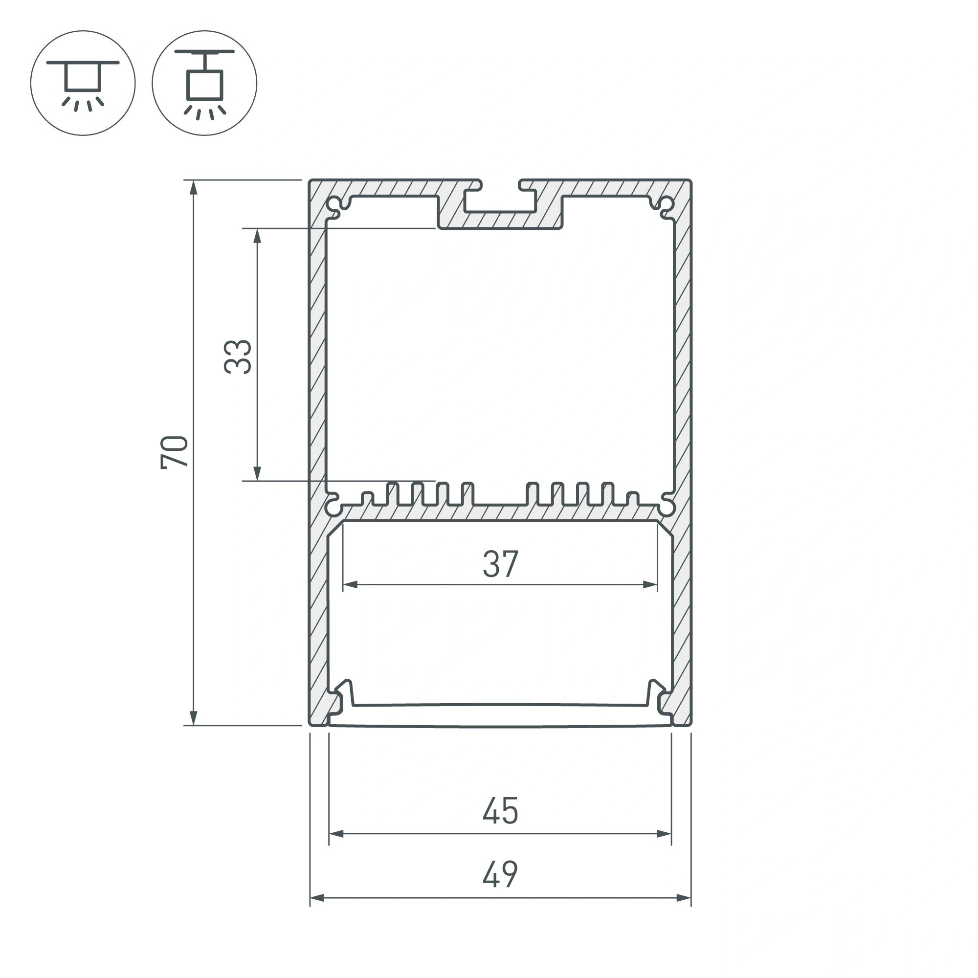 Подвесной/накладной профиль черного цвета из алюминия с отсеком для блока питания (33х45 мм) в комплекте с матовым рассеивателем из поликарбоната со светопропусканием 67% и заглушками идеально подходит для основного освещения и контурной подсветки. Габаритные размеры профиля составляют 2500 мм в длину, 49 мм в ширину и 70 мм в высоту. Площадка для установки светодиодных лент позволяет использовать ленту шириной до 37 мм и мощностью до 62,4 Вт/м. Это обеспечивает гибкость в выборе светодиодных лент и создает потрясающие световые решения. Прочие аксессуары не включены в комплект и приобретаются отдельно. Цена указана за комплект. Отличное решение для создания современных световых проектов.