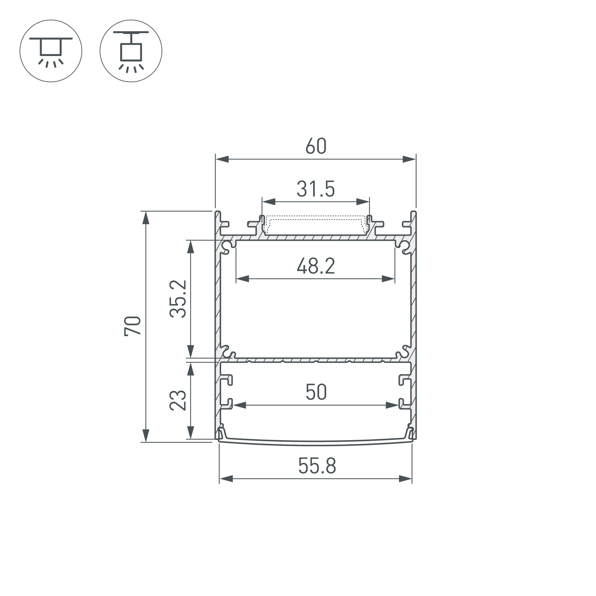 Подвесной профиль из анодированного алюминия с отсеком для блока питания (48,2х35,2 мм) с двусторонним свечением для создания эффекта «отраженного света» идеально подходит для основного освещения помещений. Габаритные размеры профиля составляют 3000 мм в длину, 60 мм в ширину и 70 мм в высоту. Площадки для установки светодиодных лент позволяют использовать ленты шириной до 50 мм и 31,5 мм (отраженный свет) и общей мощностью до 67 Вт/м. Это обеспечивает гибкость в выборе светодиодных лент и создает потрясающие световые решения. Экраны, заглушки и другие аксессуары не включены в комплект и приобретаются отдельно. Цена указана за 1 метр профиля. Отличное решение для создания современных световых проектов.
