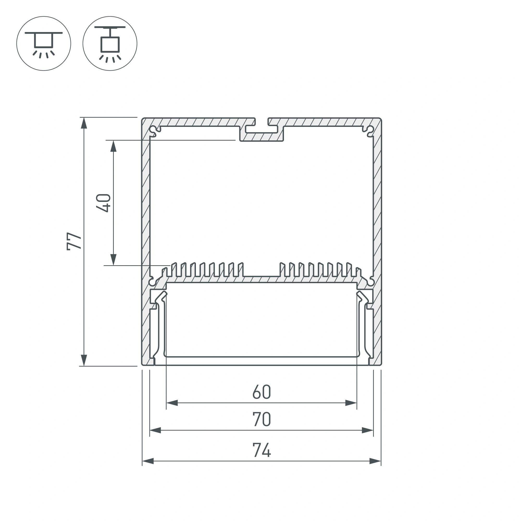 Подвесной/накладной профиль из анодированного алюминия с отсеком для блока питания (70х40 мм) в комплекте с матовым рассеивателем из поликарбоната со светопропусканием 67% идеально подходит для основного освещения и контурной подсветки. Габаритные размеры профиля составляют 2500 мм в длину, 74 мм в ширину и 77 мм в высоту. Площадка для установки светодиодных лент позволяет использовать ленту шириной до 60 мм и мощностью до 79,2 Вт/м. Это обеспечивает гибкость в выборе светодиодных лент и создает потрясающие световые решения. Заглушки и другие аксессуары не включены в комплект и приобретаются отдельно. Цена указана за комплект. Отличное решение для создания современных световых проектов.
