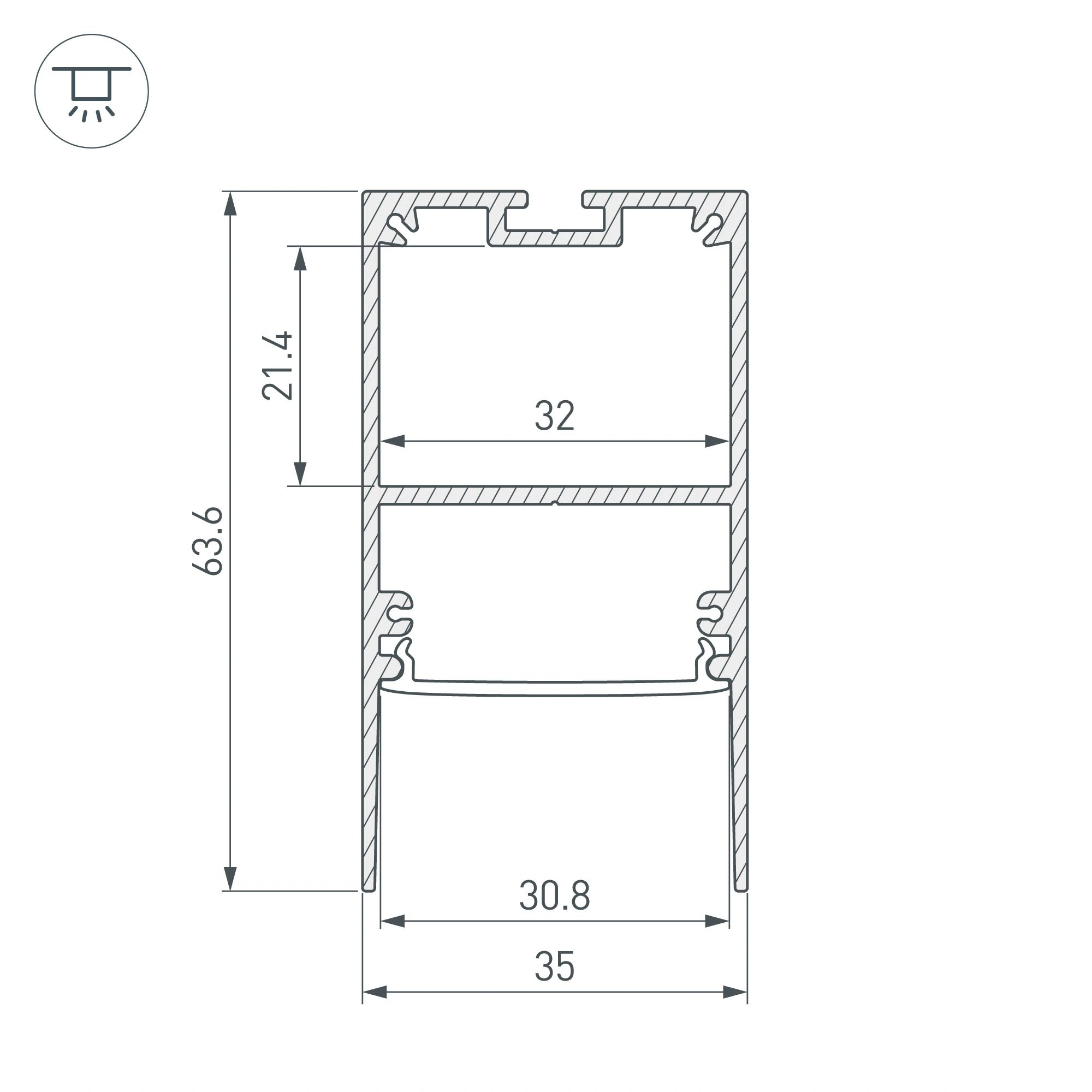 Алюминиевый анодированный профиль для светодиодных лент и линеек. Экран утоплен в плоскости профиля, что позволяет скрыть источник света от прямого контакта с глазами. Габаритные размеры (L×W×H): 2000x35x64 мм. Ширина площадки для ленты 32 мм. Отсек для БП 32х21,4мм. Экраны, заглушки и другие аксессуары приобретаются отдельно. Цена за 1 метр. Минимальный заказ 200 м.