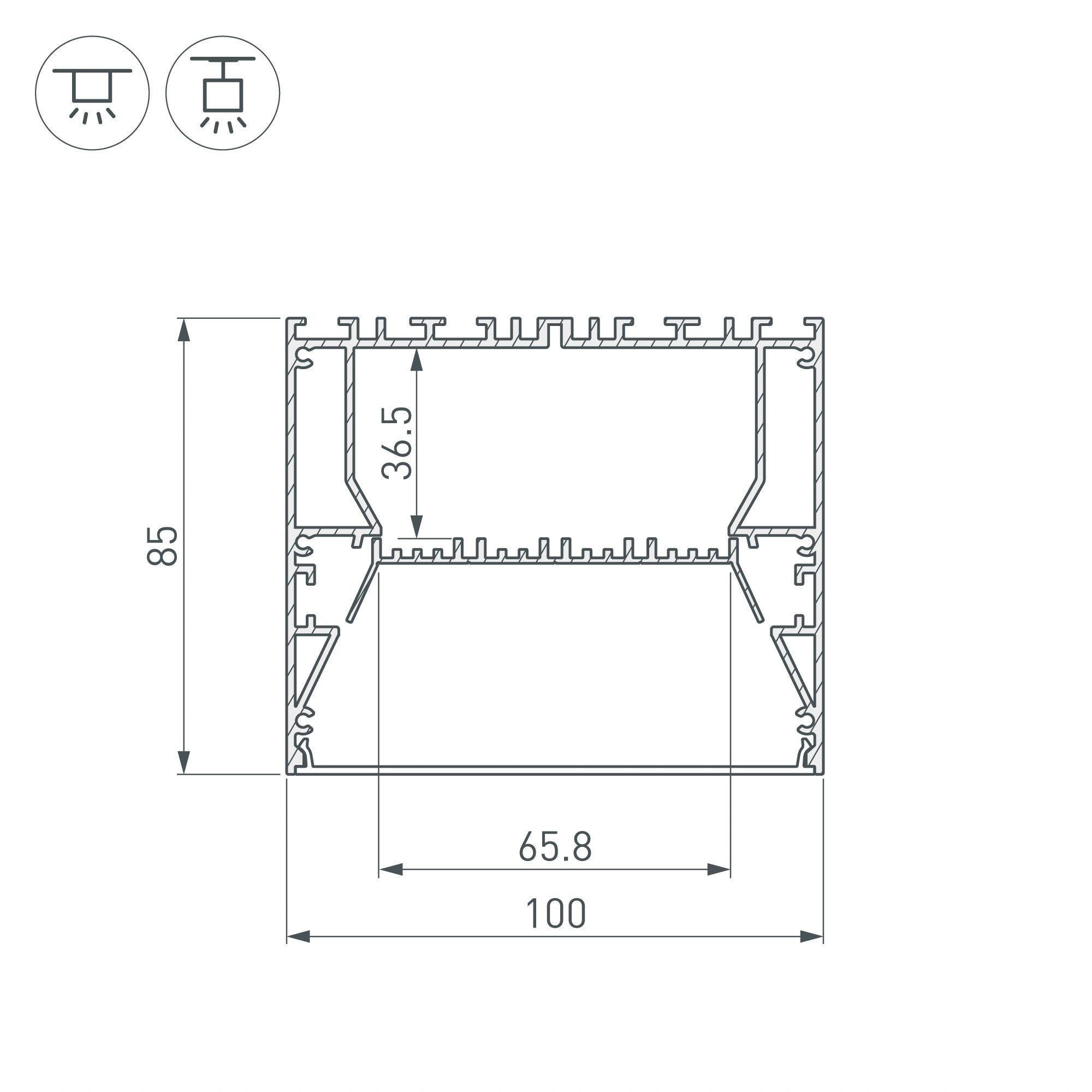 Накладной/подвесной профиль из анодированного алюминия для основного освещения и контурной подсветки. Отсек для блока питания (64х33 мм) и съемная площадка для светодиодной ленты значительно облегчают сервисное обслуживание осветительного оборудования. Габаритные размеры профиля составляют 2000 мм в длину, 100 мм в ширину и 85 мм в высоту. Площадка для установки светодиодных лент позволяет использовать ленту шириной до 65,8 мм и мощностью до 46 Вт/м. Это обеспечивает гибкость в выборе светодиодных лент и создает потрясающие световые решения. Экран, заглушки и другие аксессуары (в том числе фиксаторы для соединения профиля с площадкой для ленты) не включены в комплект и приобретаются отдельно. Цена указана за 1 метр профиля. Отличное решение для создания современных световых проектов.