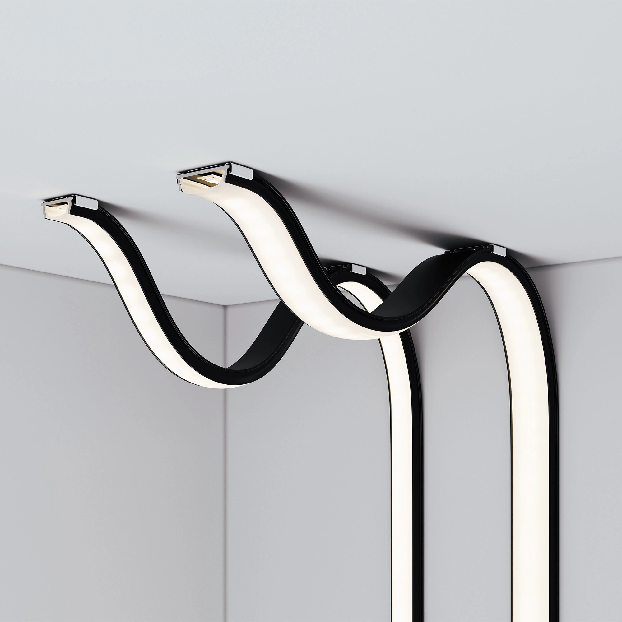 Накладной гибкий профиль черного цвета из анодированного алюминия для контурной подсветки изогнутых поверхностей, а также для создания световых линий различных форм. Габаритные размеры профиля составляют 2000 мм в длину, 18 мм в ширину и 4 мм в высоту. Площадка для установки светодиодных лент позволяет использовать ленту шириной до 14,3 мм и мощностью до 12 Вт/м. Это обеспечивает гибкость в выборе светодиодных лент и создает потрясающие световые решения. Профилю можно придавать формы полукруга, волн, окружностей и т.д. в вертикальной плоскости. Минимальный диаметр окружности 200 мм. Легко гнется руками. Экраны, заглушки и другие аксессуары не включены в комплект и приобретаются отдельно. Цена указана за 1 метр профиля.