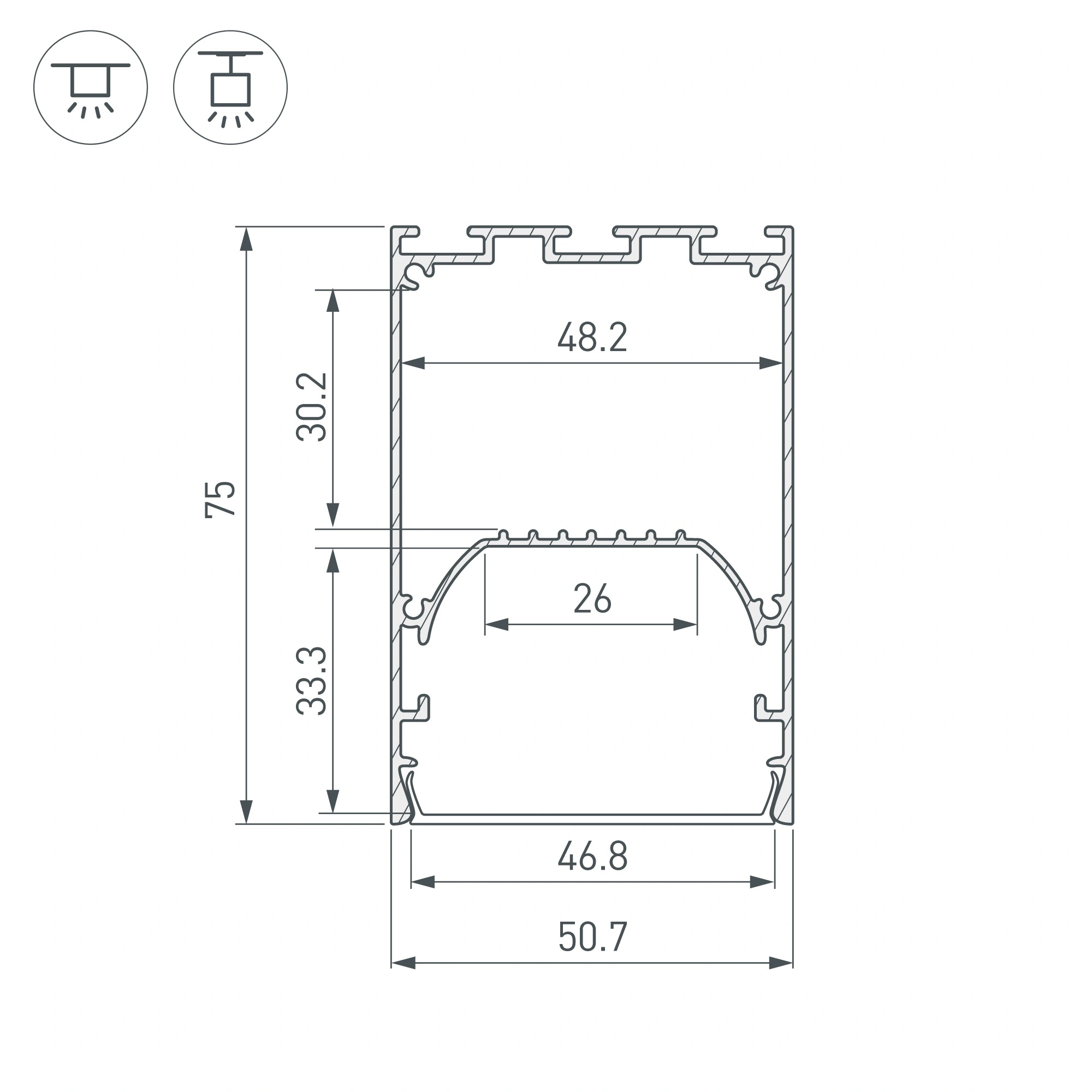 Подвесной/накладной профиль из анодированного алюминия с отсеком для блока питания (48,2х30,2 мм) для основного освещения и контурной подсветки. Габаритные размеры профиля составляют 2500 мм в длину, 50,7 мм в ширину и 75 мм в высоту. Площадка для установки светодиодных лент позволяет использовать ленту шириной до 26 мм и мощностью до 65 Вт/м. Это обеспечивает гибкость в выборе светодиодных лент и создает потрясающие световые решения. Экраны, заглушки и другие аксессуары не включены в комплект и приобретаются отдельно. Цена указана за 1 метр профиля. Отличное решение для создания современных световых проектов. При изготовлении светильников длиной, превышающей длину профиля, соединители необходимо крепить к стенками профиля винтами с минимальным усилием, до первого ощущения сопротивления.