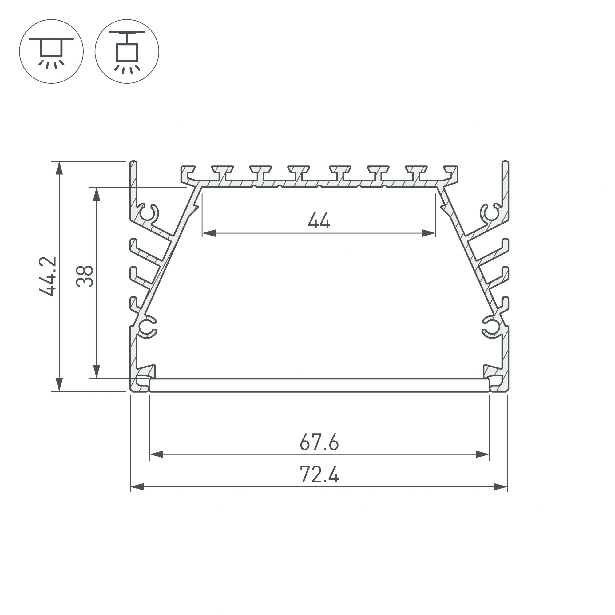 Накладной/подвесной профиль из анодированного алюминия для основного освещения и контурной подсветки. Габаритные размеры профиля составляют 2000 мм в длину, 72,4 мм в ширину и 44,2 мм в высоту. Площадка для установки светодиодных лент позволяет использовать ленту шириной до 44 мм и мощностью до 54,8 Вт/м. Это обеспечивает гибкость в выборе светодиодных лент и создает потрясающие световые решения. Экраны, заглушки и другие аксессуары не включены в комплект и приобретаются отдельно. Цена указана за 1 метр профиля. Отличное решение для создания современных световых проектов.