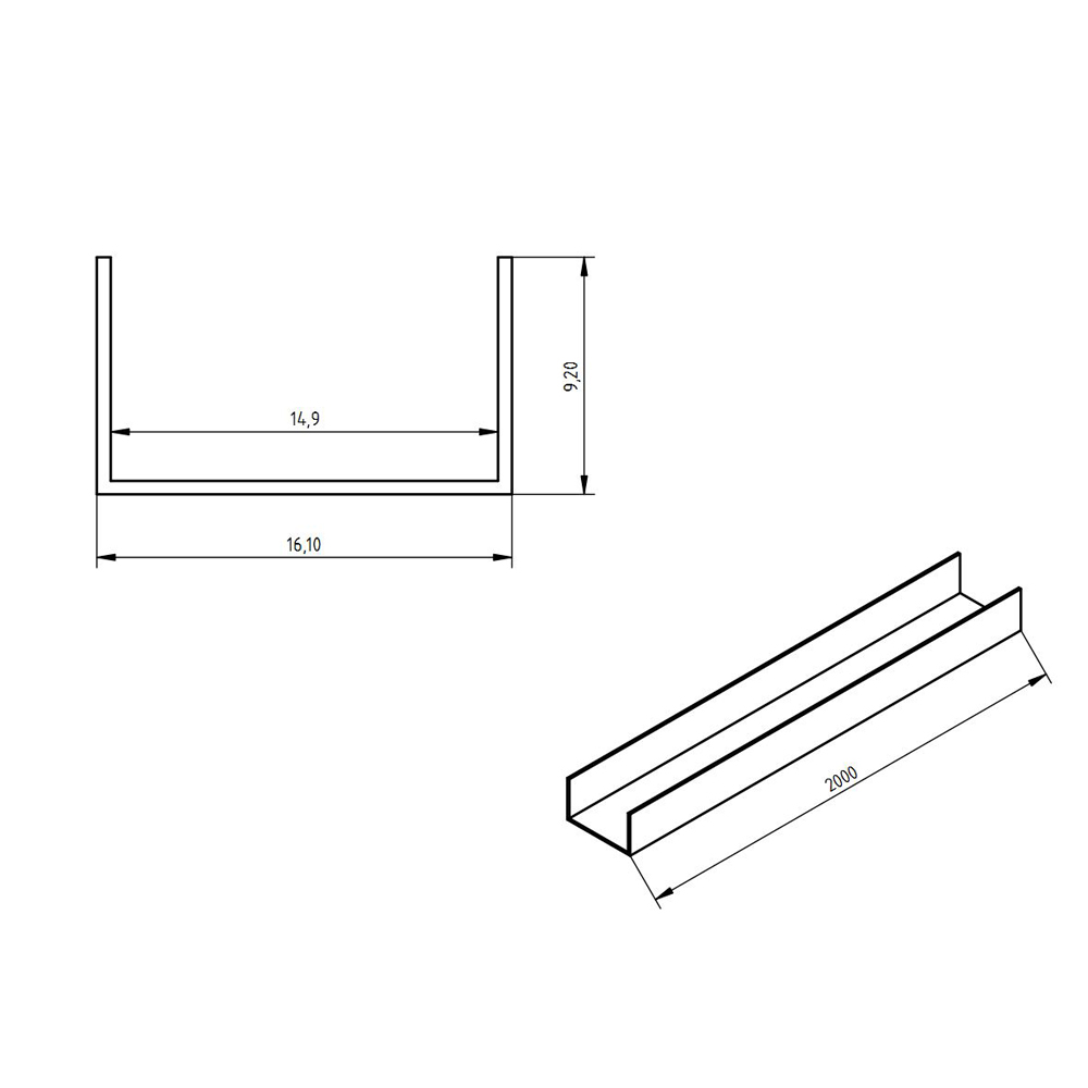 Алюминиевый анодированный профиль. Для лент шириной до 14.9мм. Размеры 2000х16.1x9.2мм. Без рассеивателя. Вес 270г.