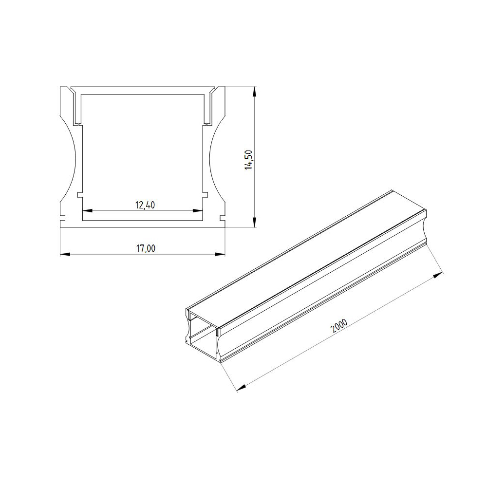Алюминиевый анодированный профиль. Для лент шириной до 12мм. Размеры 2000x17x14.5мм. В комплекте с матовым рассеивателем. Вес 290г.