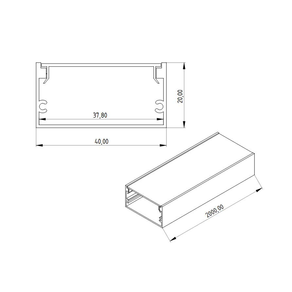 Цена указана за комплект. Алюминиевый анодированный профиль. Для лент шириной до 36мм. Размеры 2000х40х20мм. Вес 590г. В комплекте с матовым рассеивателем.