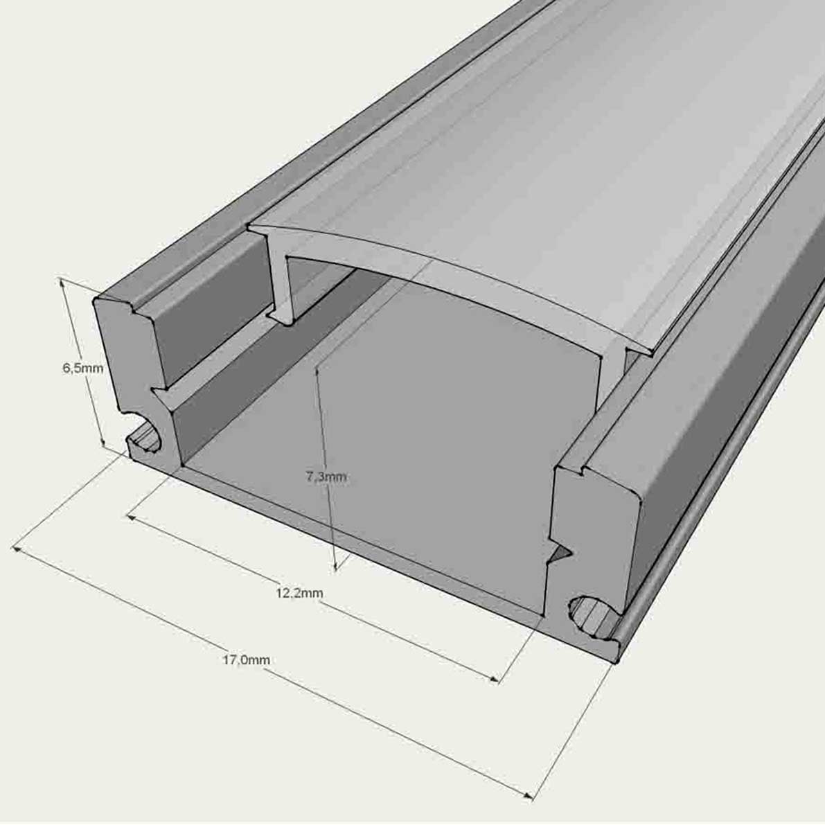 Цена указана за комплект. Алюминиевый анодированный профиль. Для лент шириной до 12,2мм. Размеры 2000х16,8х7,3мм. Вес 200г. В комплекте с матовым рассеивателем.