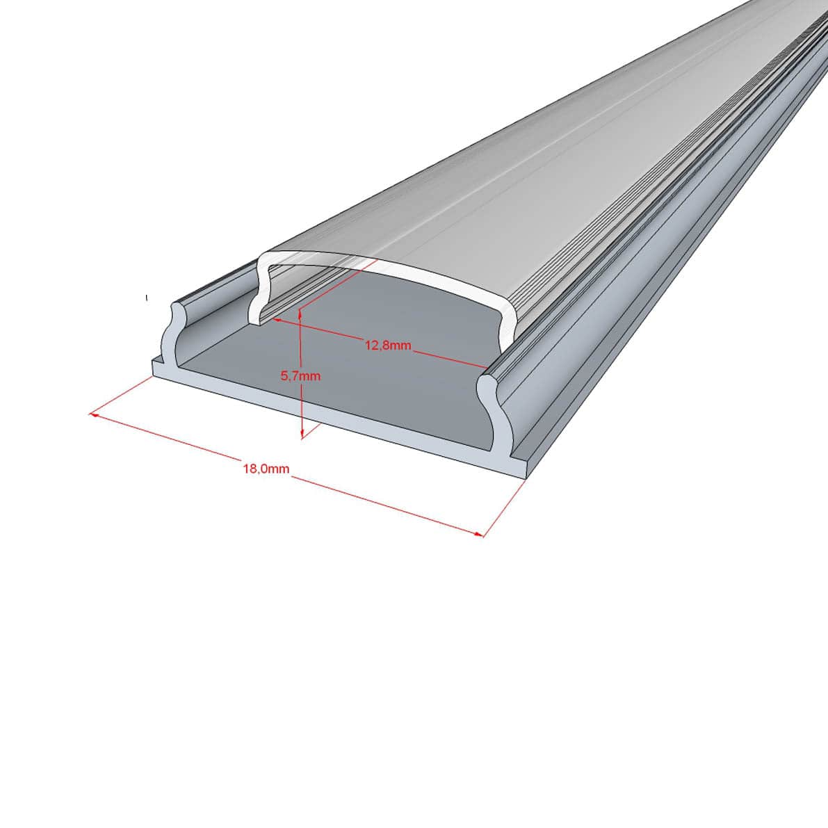 Цена указана за комплект. Гибкий алюминиевый анодированный профиль. Матовый экран из поликарбоната устойчивый к УФ-лучам. Для лент шириной до 12мм. Минимальный радиус изгиба 153мм. Размеры 2000х18х5,7мм. В комплекте с матовым рассеивателем. Вес 140гр.