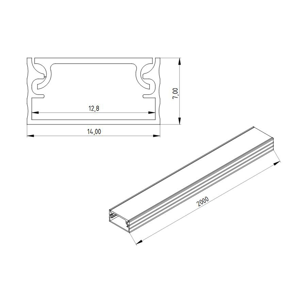 Цена указана за комплект. Алюминиевый анодированный профиль. Для лент шириной до 12мм. Размеры 2000х14x7мм. В комплекте с матовым рассеивателем. Вес 100г.