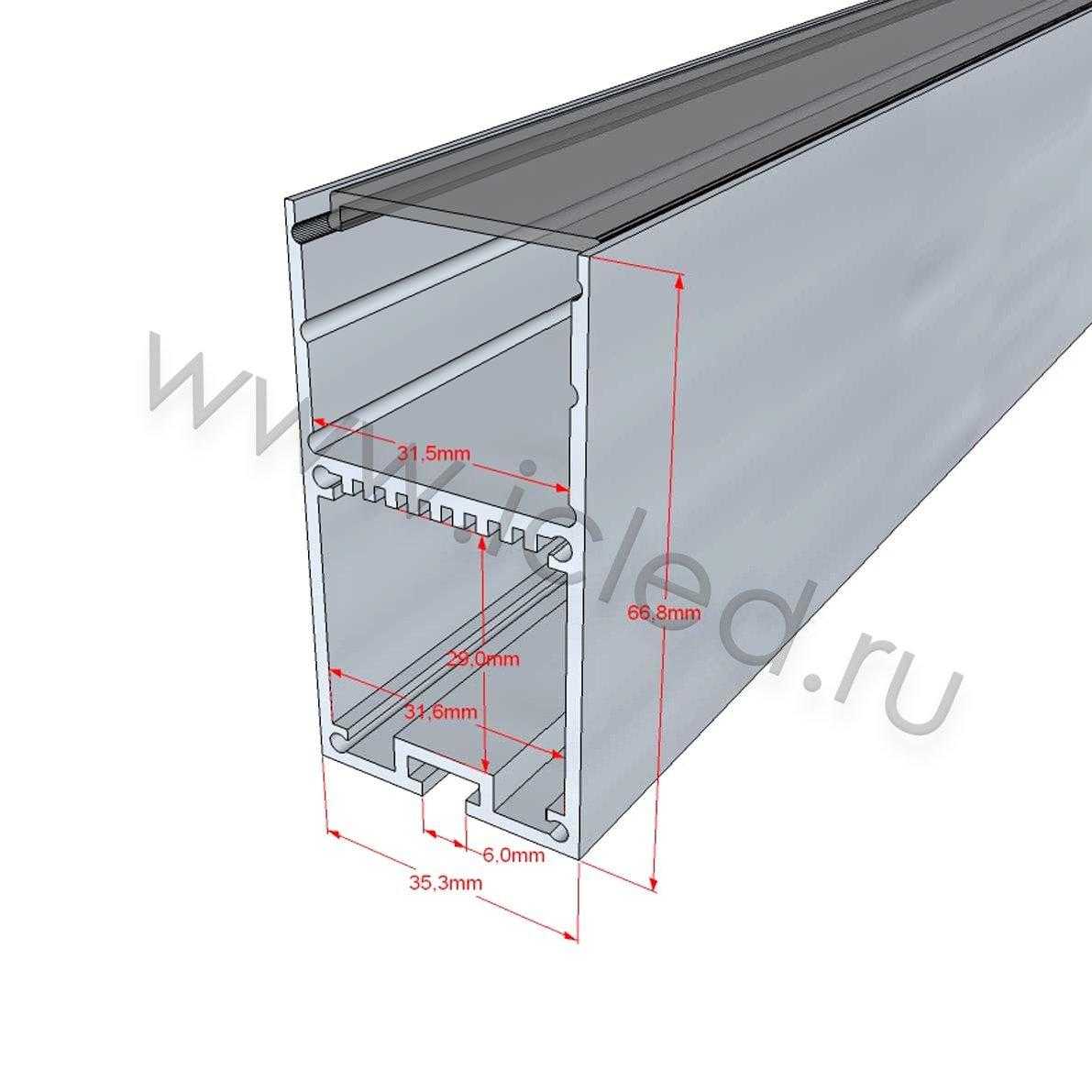 Цена указана за комплект. Алюминиевый анодированный профиль. Для лент шириной до 31,5мм. Размеры 2000х35,3х67мм. Максимальные размеры блока питания для этого профиля: ширина 31,5мм, высота 30мм. В комплекте с матовым рассеивателем.
