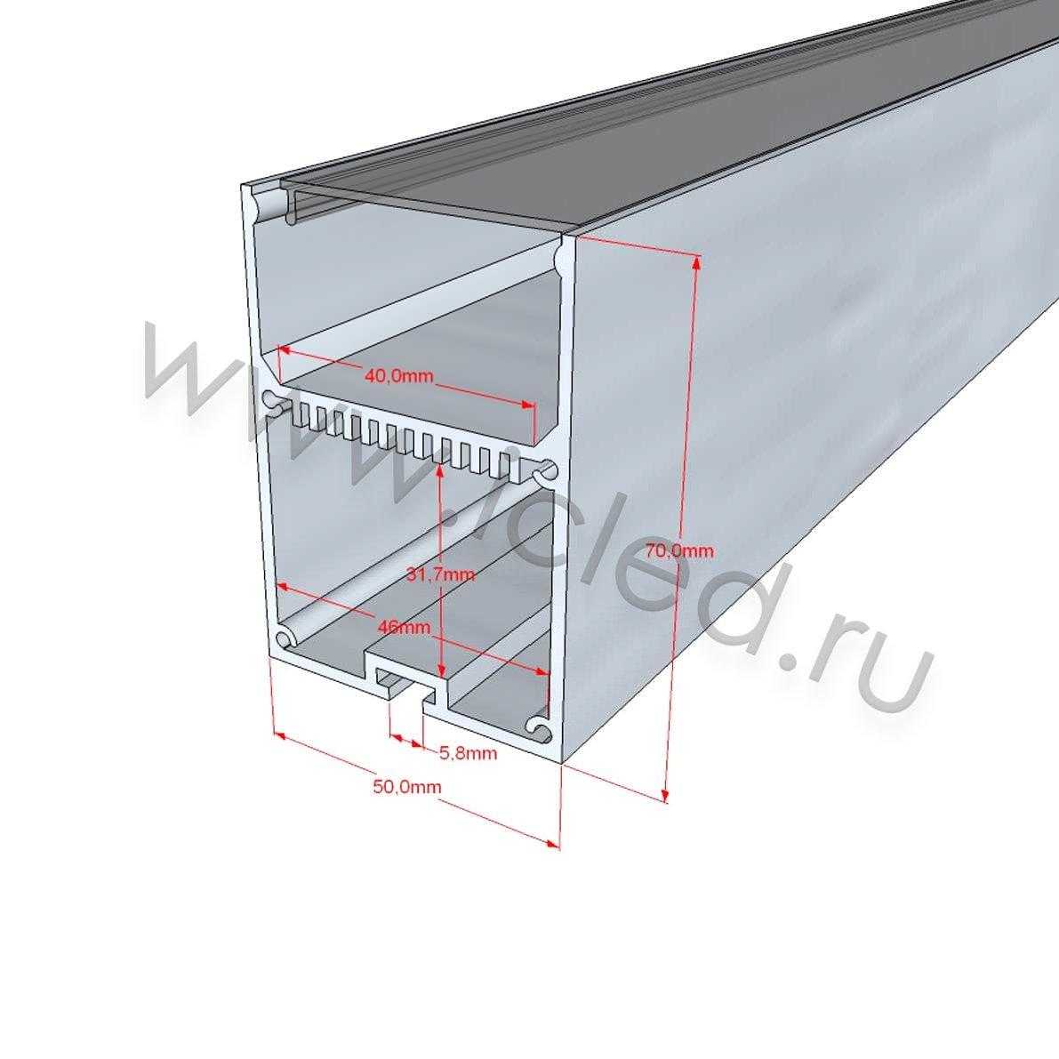 Цена указана за комплект. Алюминиевый анодированный профиль. Для лент шириной до 40мм. Размеры 2000х50х70мм. Максимальные размеры блока питания для этого профиля: ширина 46мм, высота 32мм. В комплекте с матовым рассеивателем.