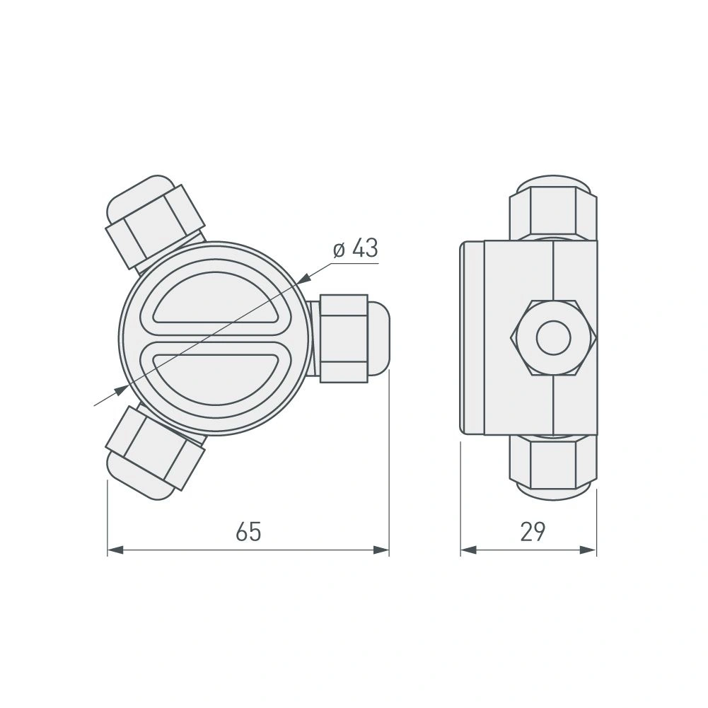 Герметичный тройник с высокой степенью защиты IP68 для электрической проводки под кабель сечением 6-9 мм. Рекомендуемое напряжение 12-24В. Габаритные размеры тройника составляют 65 мм в длину, 65 мм в ширину и 29 мм в высоту. Для использования на улице, под землей, в местах высокой влажности и скопления воды.