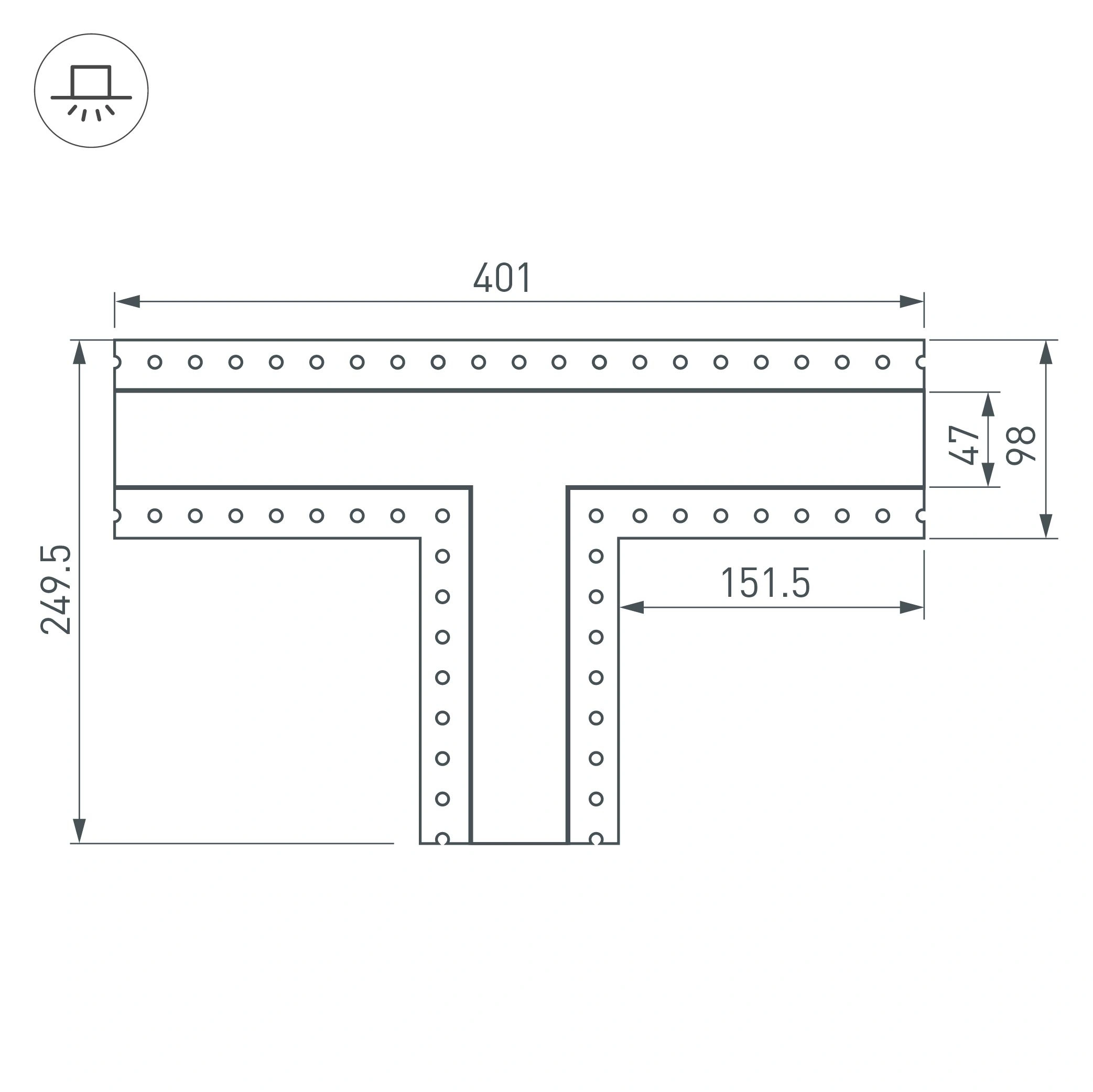 Т-образный угол в сборе со скрытым фланцем под строительную отделку для соединения трех профилей SL-LINIA45-FANTOM под прямыми углами 90° в одной плоскости в комплекте с матовым экраном и соединителями. Экран образует Т-образную фигуру на плоскости. Применятся при изготовлении светильников сложной геометрии. Длина внешней стороны угла 249,5мм. Цена за комплект.