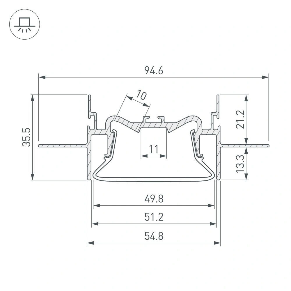 Встраиваемый алюминиевый профиль (центральная линия) для дизайнерских решений «линии света» в натяжных потолках. Решение 2-в-1: служит каркасом для крепления натяжного потолка и профилем для установки светодиодной ленты. Габаритные размеры профиля составляют 2000 мм в длину, 95 мм в ширину и 36 мм в высоту. Площадка для установки светодиодных лент позволяет использовать ленту шириной до 11 мм и мощностью до 50 Вт/м. Это обеспечивает гибкость в выборе светодиодных лент и создает потрясающие световые решения. Экран, заглушки и другие аксессуары не включены в комплект и приобретаются отдельно. Цена указана за 1 метр профиля. Отличное решение для создания современных световых проектов.