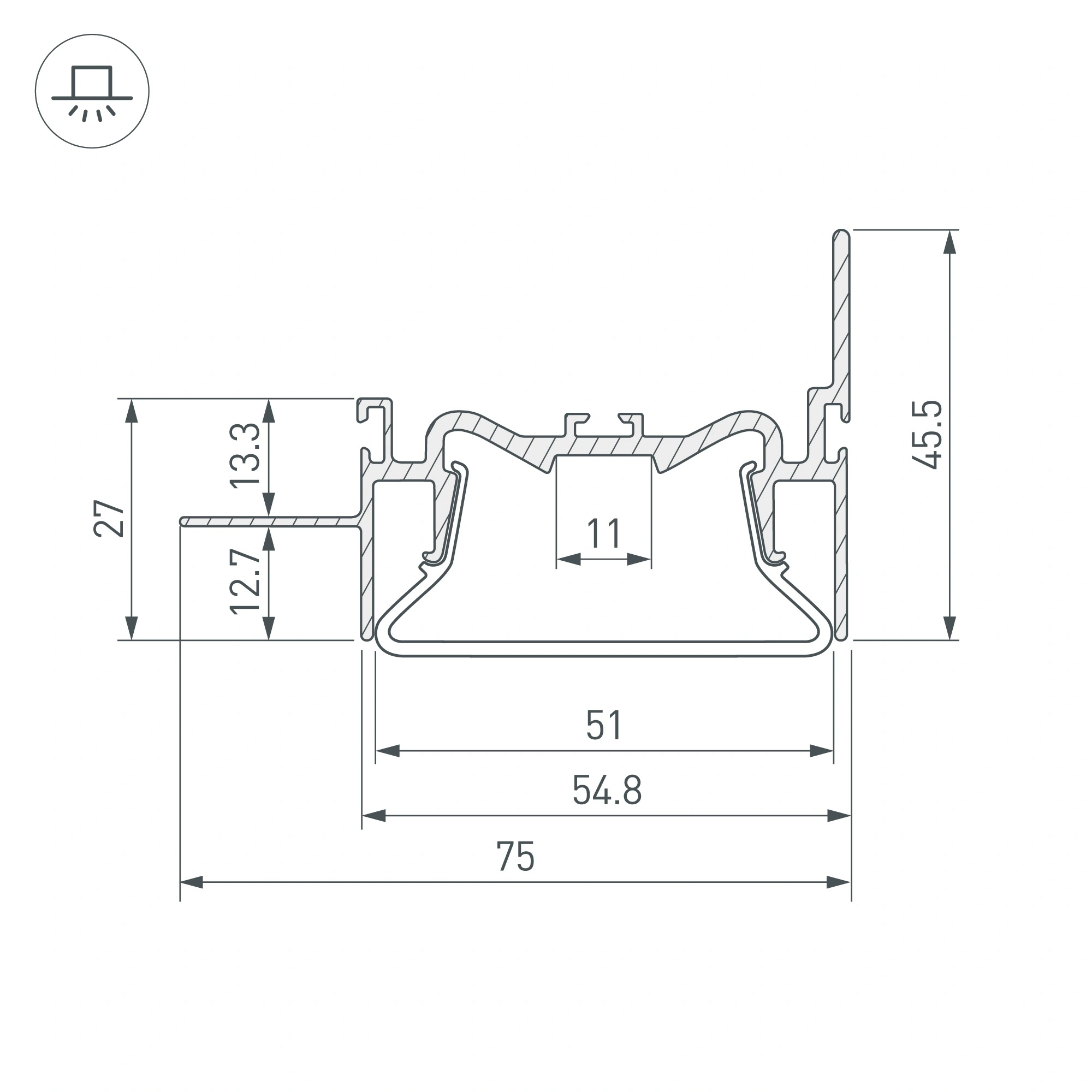 Алюминиевый профиль для натяжных потолков (боковая линия - монтаж к стене). Решение 2-в-1 - каркас для крепления натяжного потолка и профиль для установки светодиодной ленты. Для дизайнерских решений «линии света» в натяжных потолках. Монтируется к стене, накладной способ. Натяжной потолок крепится к профилю с одной стороны. Габаритные размеры (L×W×H): 2000x75x45,5мм. Ширина площадки для ленты 11мм. Экраны, заглушки и другие аксессуары приобретаются отдельно. Цена за 1 метр.