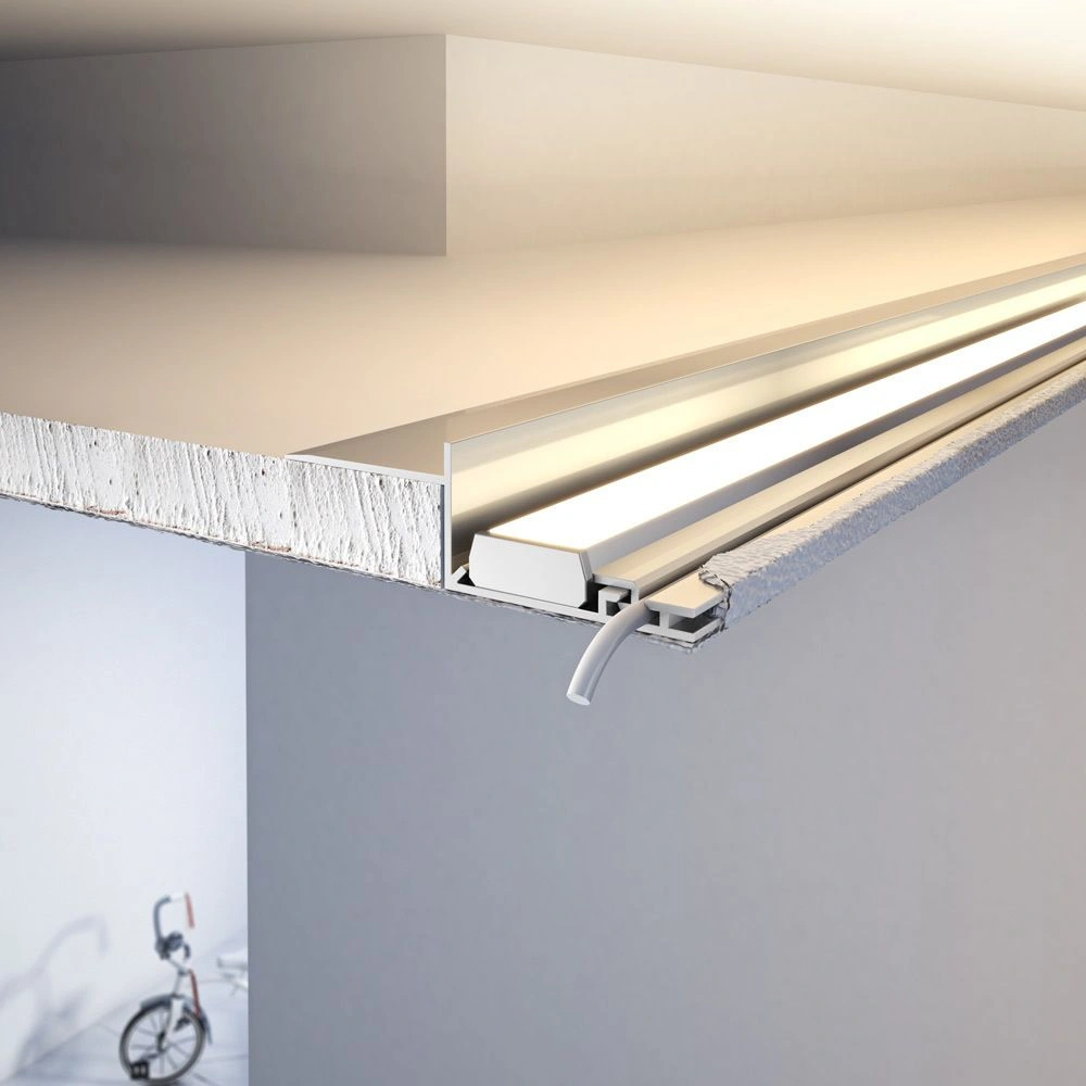 Алюминиевый профиль для светодиодных лент и линеек, для подсветки потолочных ниш. "Тонкий край" под финишную отделку. Луч света направлен перпендикулярно плоскости потолка. В комплекте: основание, профиль, силиконовый уплотнительный шнур. Габаритные размеры (L×W×H): 2000x57x17 мм. Ширина площадки для ленты 10 мм. Экраны, заглушки и другие аксессуары приобретаются отдельно. Цена за 1 метр.
