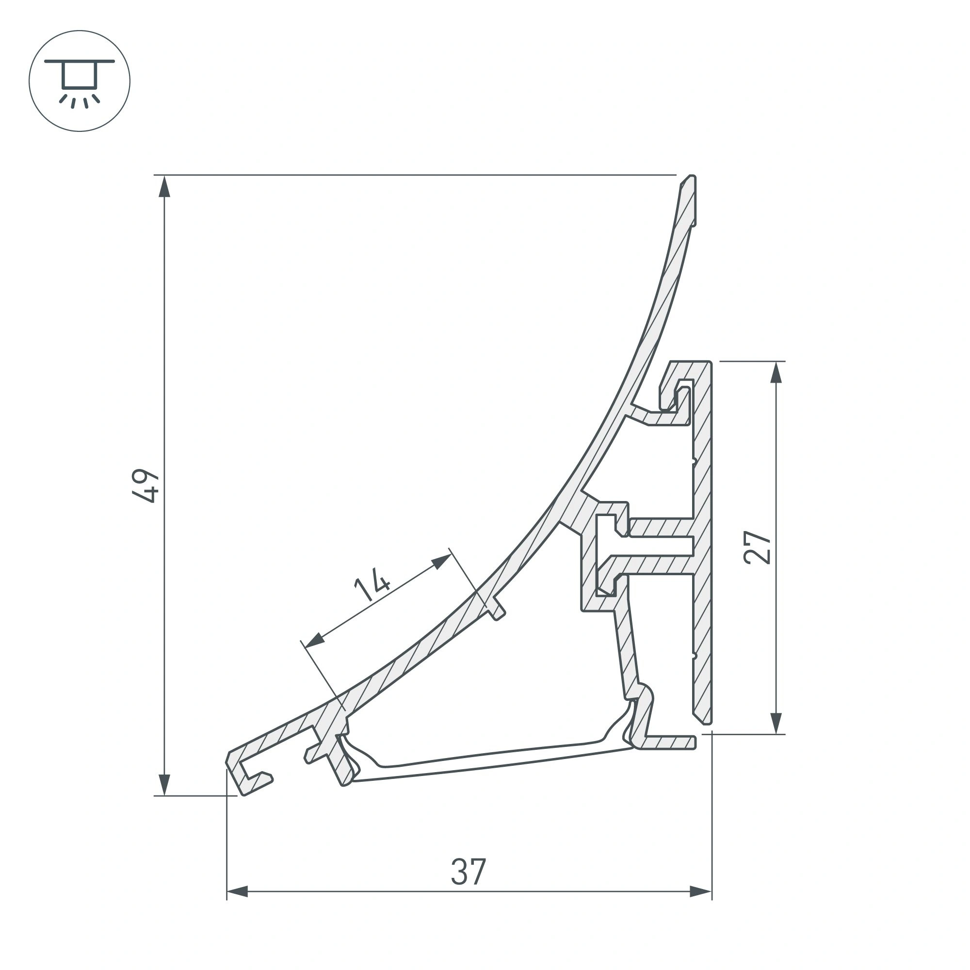 Алюминиевый анодированный профиль для подсветки стен и потолков. Состоит из двух частей - основания и профиля для светодиодной ленты. Габаритные размеры (L×W×H): 2000x49x37 мм. Ширина площадки для ленты 14 мм. Экраны, заглушки и другие аксессуары приобретаются отдельно. Скобы для соединения двух частей профиля идут в комплекте (3 шт на 2 м.). Цена за 1 метр.