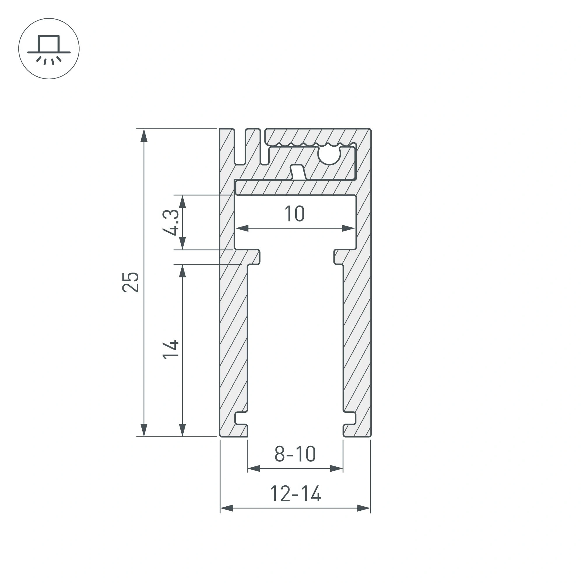 Алюминиевый анодированный профиль для светодиодной подсветки стекла 8-10мм. Фиксируется на кромке стекла на глубину 14мм при помощи 2-х стороннего скотча. Размер 2000х25, высота на стекле 8мм - 12 мм; на стекле 10мм - 14 мм. Ширина площадки для ленты 5 мм. Заглушки и другие аксессуары приобретаются отдельно. Цена за 1 метр.