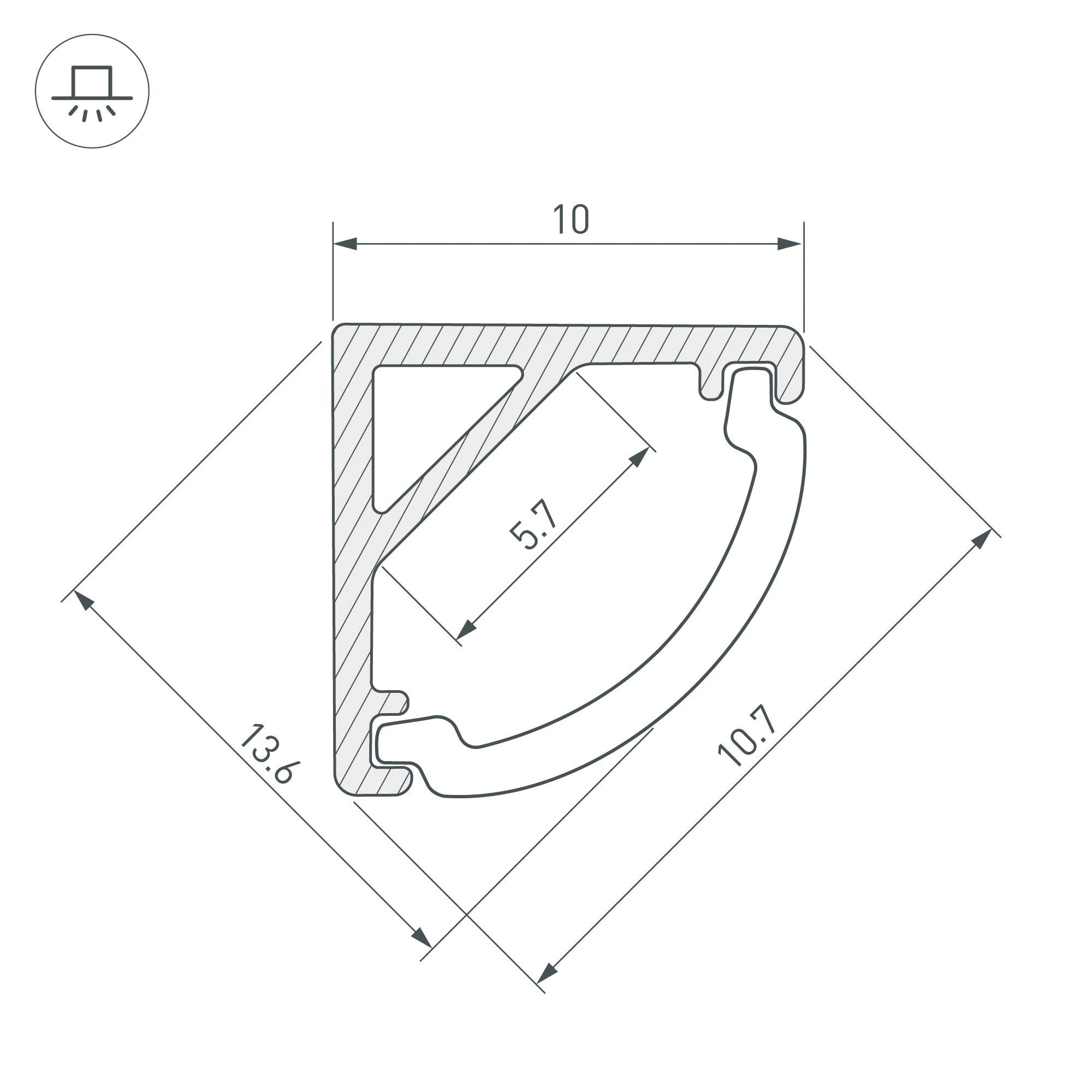 Алюминиевый анодированный угловой профиль для светодиодных лент и линеек. Габаритные размеры (L×W×H): 2000x10x10 мм. Ширина площадки для ленты 5,7 мм. Экраны, заглушки и другие аксессуары приобретаются отдельно. Цена за 1 метр.