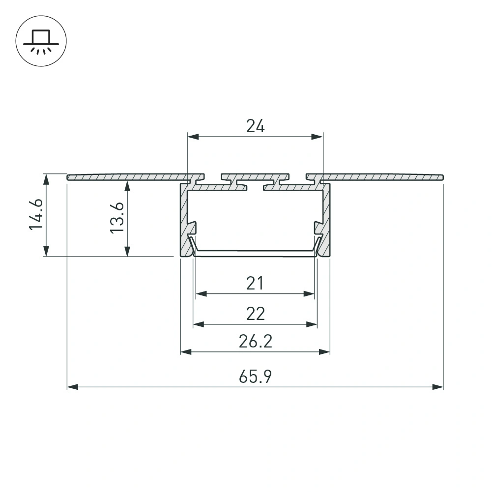 Алюминиевый профиль для светодиодных лент и линеек, встраиваемый в гипсокартон толщиной 12 мм, под строительную отделку. Позволяет создать линию света шириной 22 мм. без видимых частей алюминия. Монтируется между двумя листами гипсокартона. Габаритные размеры (L×W×H): 3000x65,9x14,6 мм. Ширина площадки для ленты 24 мм. Экраны, заглушки и другие аксессуары приобретаются отдельно. Цена за 1 метр.