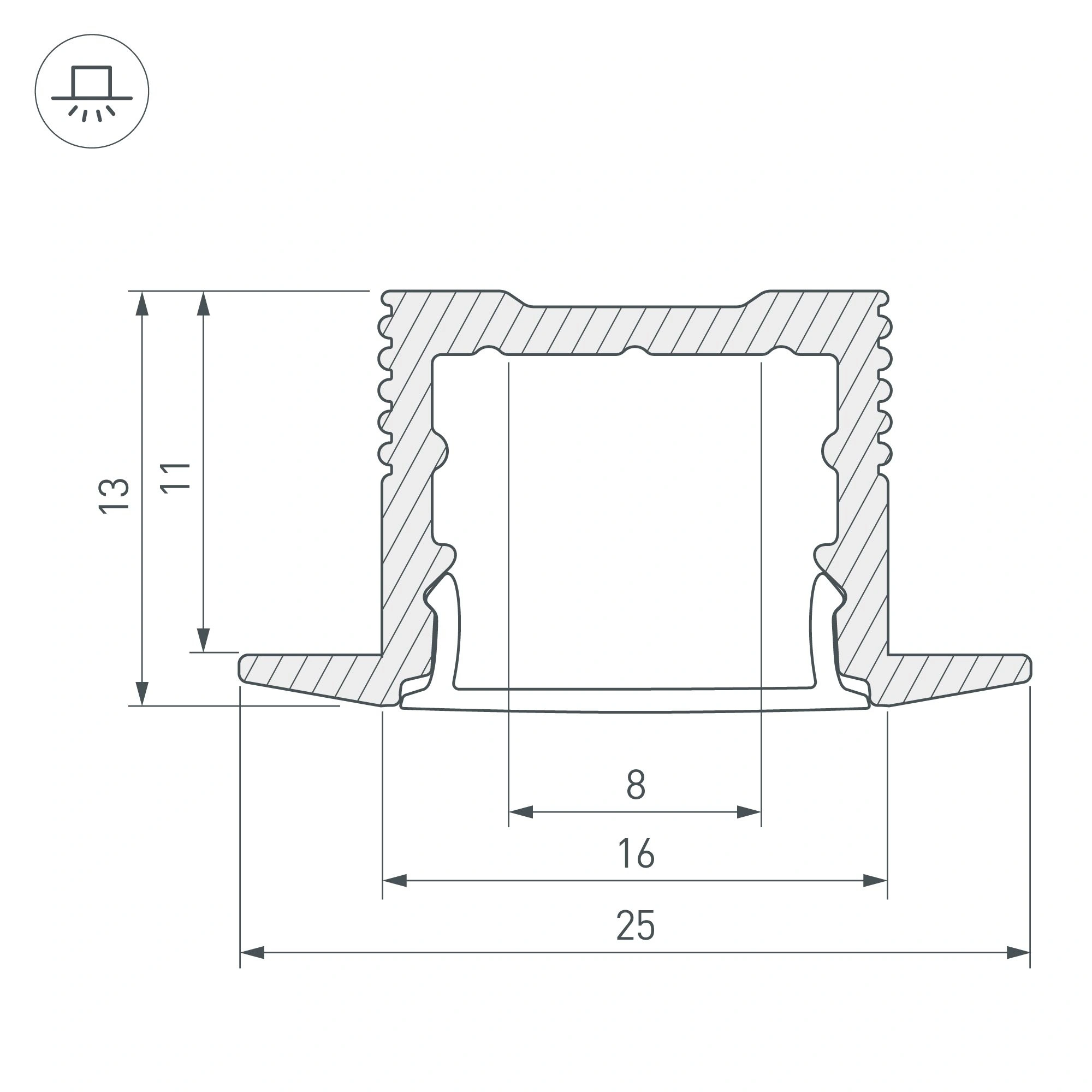 Алюминиевый профиль для светодиодных лент и линеек. Цвет - чёрный RAL9005 (порошковая окраска). Габаритные размеры (L×W×H): 2000x25x13 мм, паз для установки 16 мм. Ширина площадки для ленты 12 мм. Экраны, заглушки и другие аксессуары приобретаются отдельно. Цена за 1 метр.