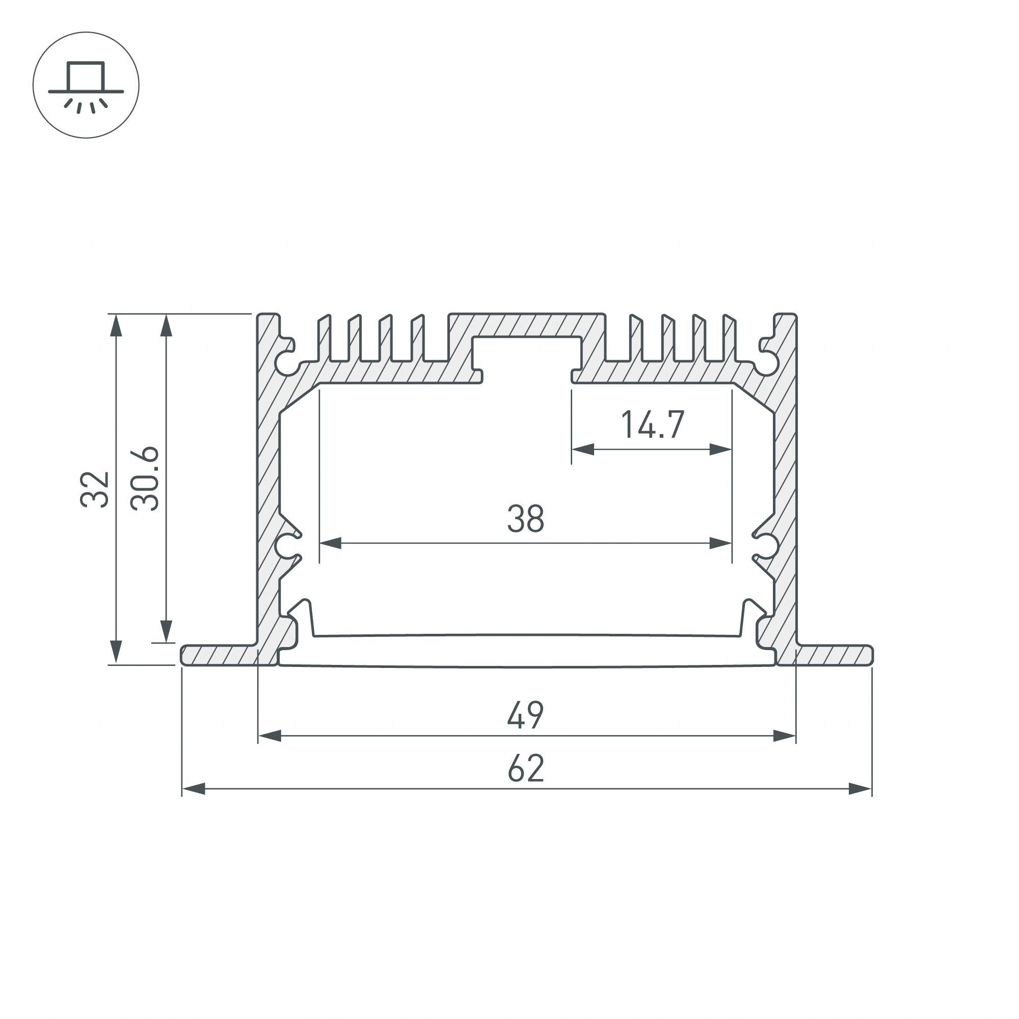 Комплект с экраном. Алюминиевый профиль для светодиодных лент и линеек. Цвет - черный RAL9005 (порошковая окраска). Габаритные размеры (L×W×H): 2500x62x32 мм, паз для установки 49 мм. Ширина площадки для ленты 38 мм. Черные заглушки в комплекте (2 шт.). Крепления приобретаются отдельно. Цена за комплект.