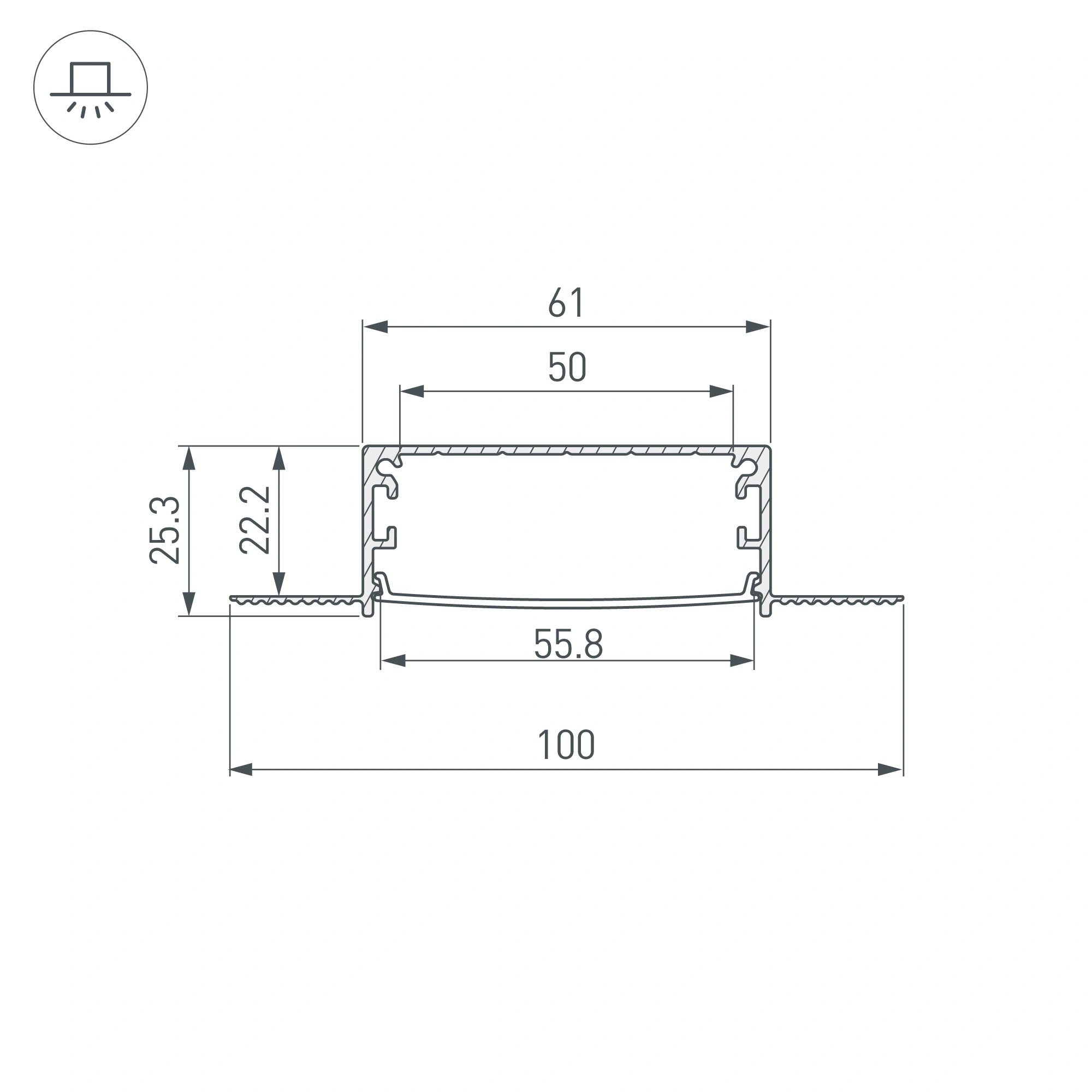 Алюминиевый анодированный профиль для встраивания в гипсокартон. Габаритные размеры (L×W×H): 3000x100x25,3 мм, паз для установки 61х22,2 мм. Ширина площадки для ленты - 50 мм. Экраны и заглушки приобретаются отдельно. Цена за 1 метр.