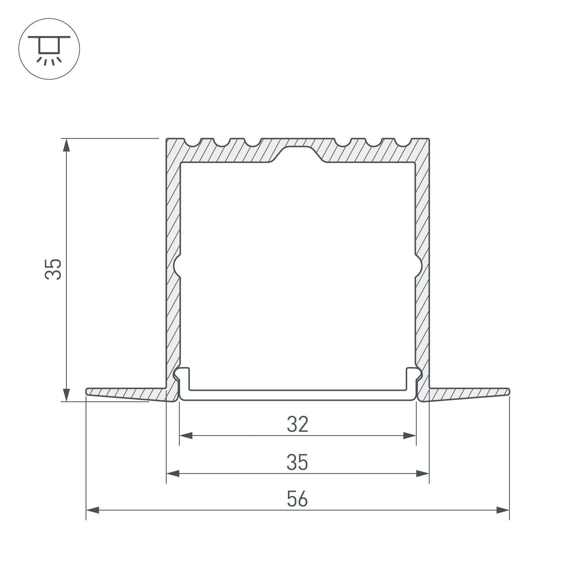 Алюминиевый анодированный встраиваемый профиль для светодиодных лент и линеек. Паз для установки 35мм. Габаритные размеры (L×W×H): 2000x56x35 мм. Ширина площадки для ленты 32 мм. Экраны, заглушки и другие аксессуары приобретаются отдельно. Цена за 1 метр.