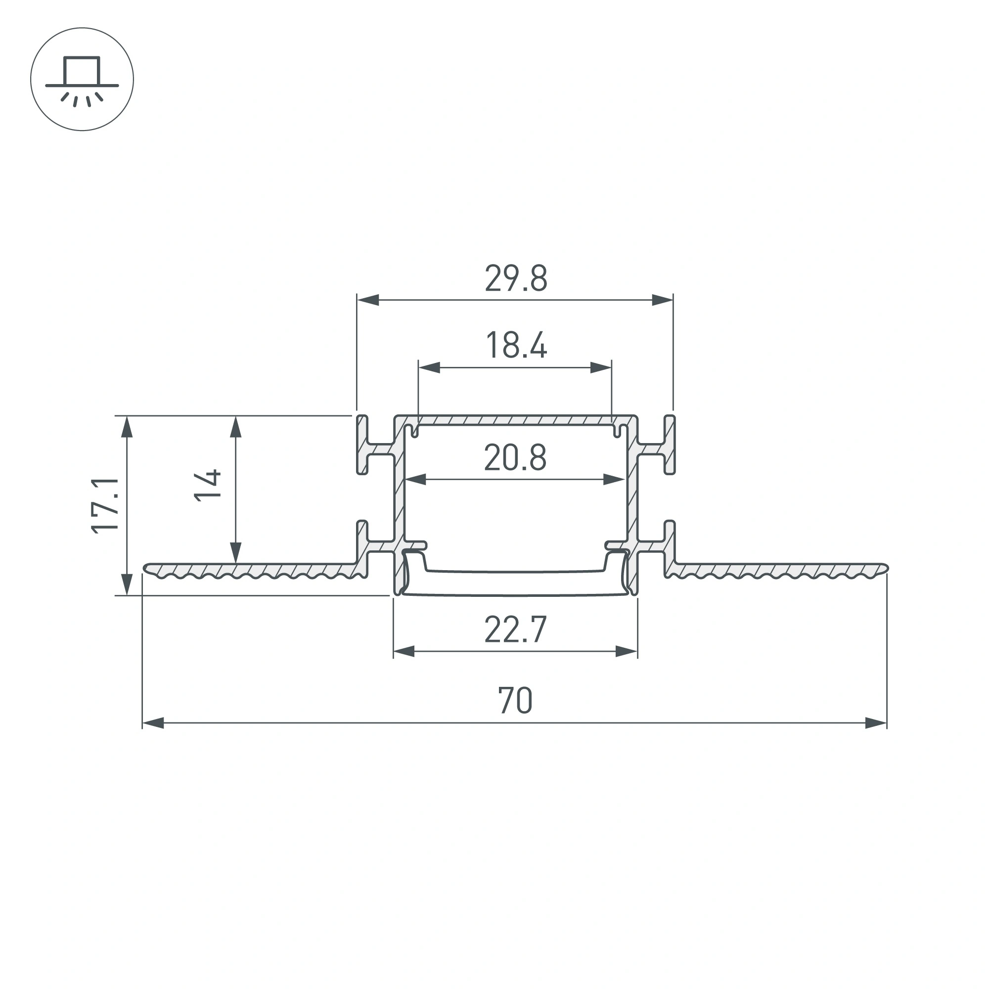 Встраиваемый профиль из анодированного алюминия со скрытым фланцем под строительную отделку устанавливается в потолки и потолочные ниши из гипсокартона. Габаритные размеры профиля составляют 2000 мм в длину, 70 мм в ширину и 17,1 мм в высоту. Площадка для установки светодиодных лент позволяет использовать ленту шириной до 17 мм и мощностью до 44 Вт/м. Это обеспечивает гибкость в выборе светодиодных лент и создает потрясающие световые решения. Совместим с гибкими алюминиевыми профилями FANTOM-BENT-W23-TOP и FANTOM-BENT-W23-SIDE. Сочетание разных видов профиля поможет подчеркнуть как прямые, так и изогнутые контуры интерьера, а также создать круги и волнообразные линии, переходящие с потолка на стены. Экраны, заглушки и другие аксессуары не включены в комплект и приобретаются отдельно. Цена указана за 1 метр профиля.