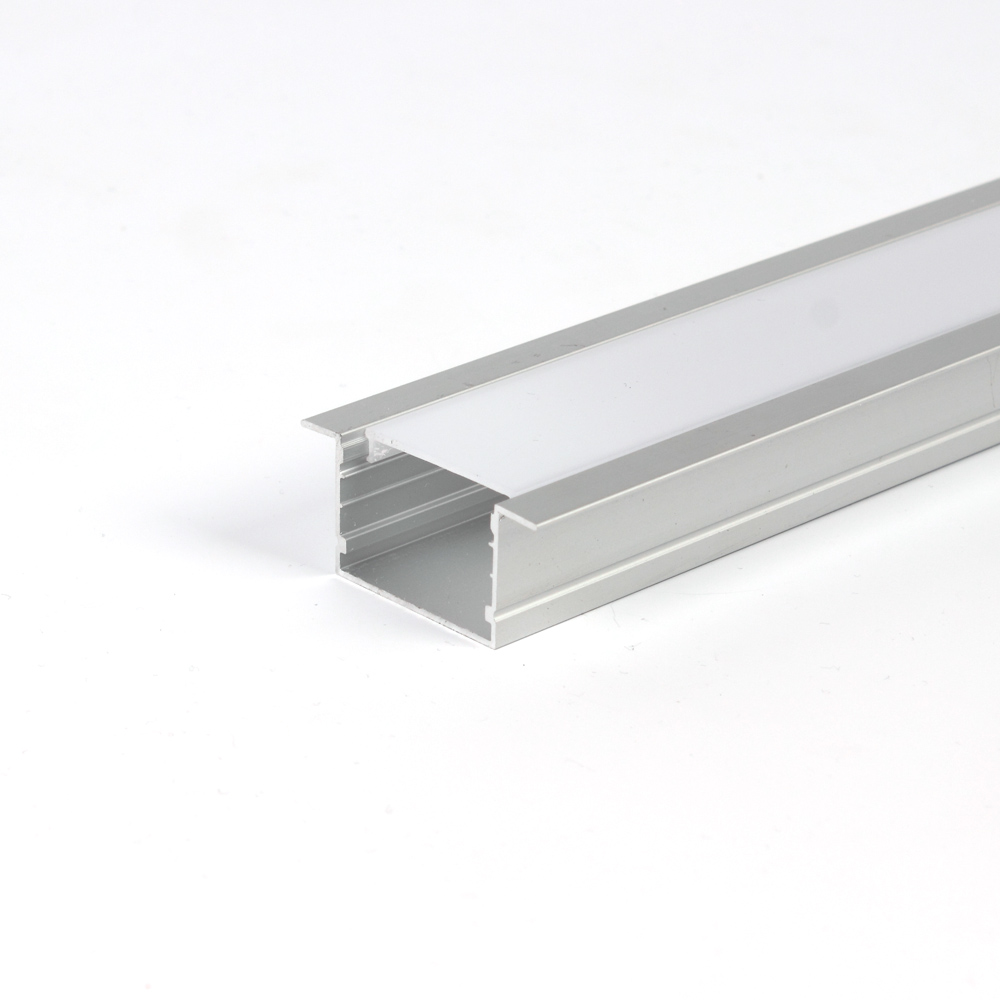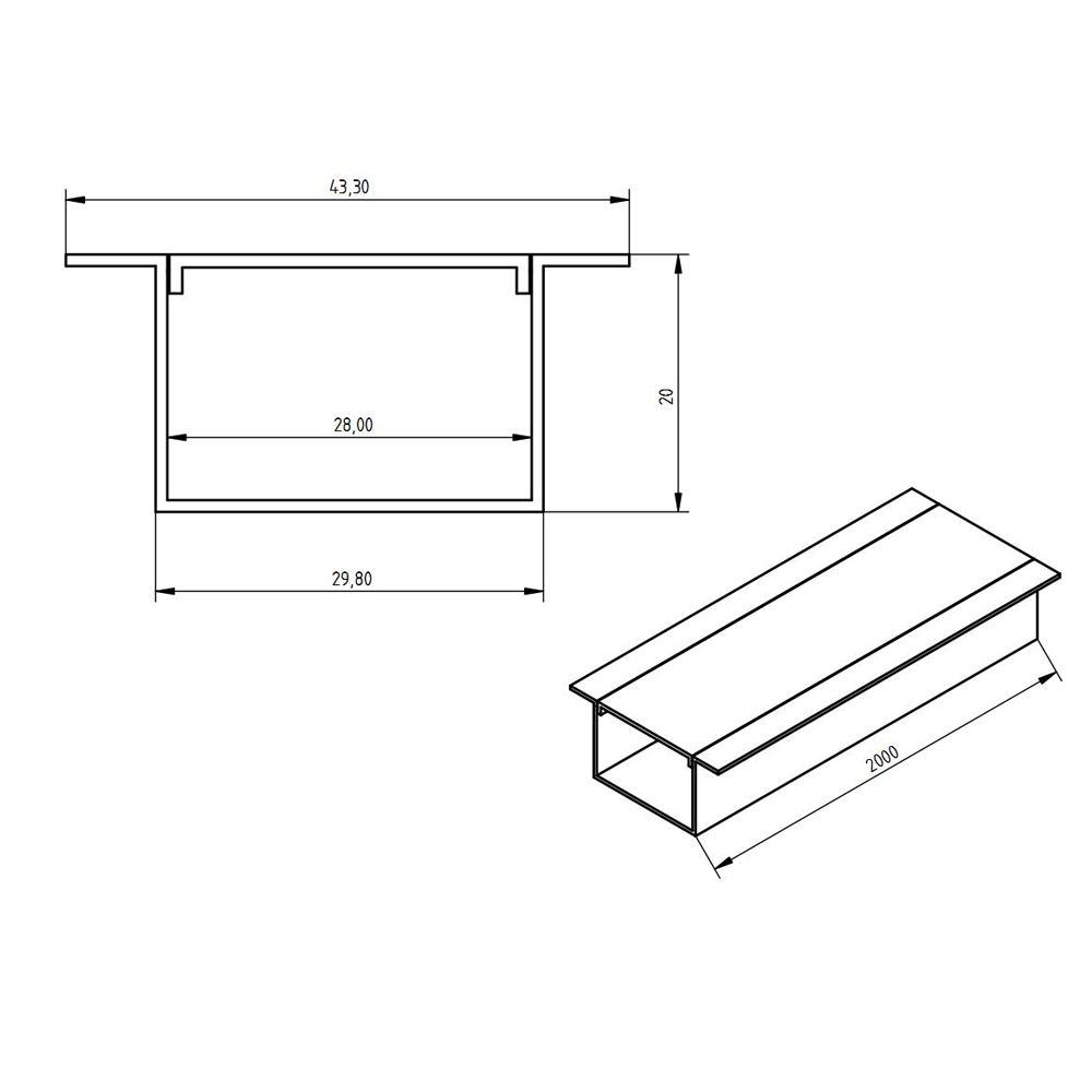 Алюминиевый анодированный профиль врезной. Для лент шириной до 28мм. Размеры 2000x43.3/29.8x20мм. В комплекте с матовым рассеивателем. Вес 510г.