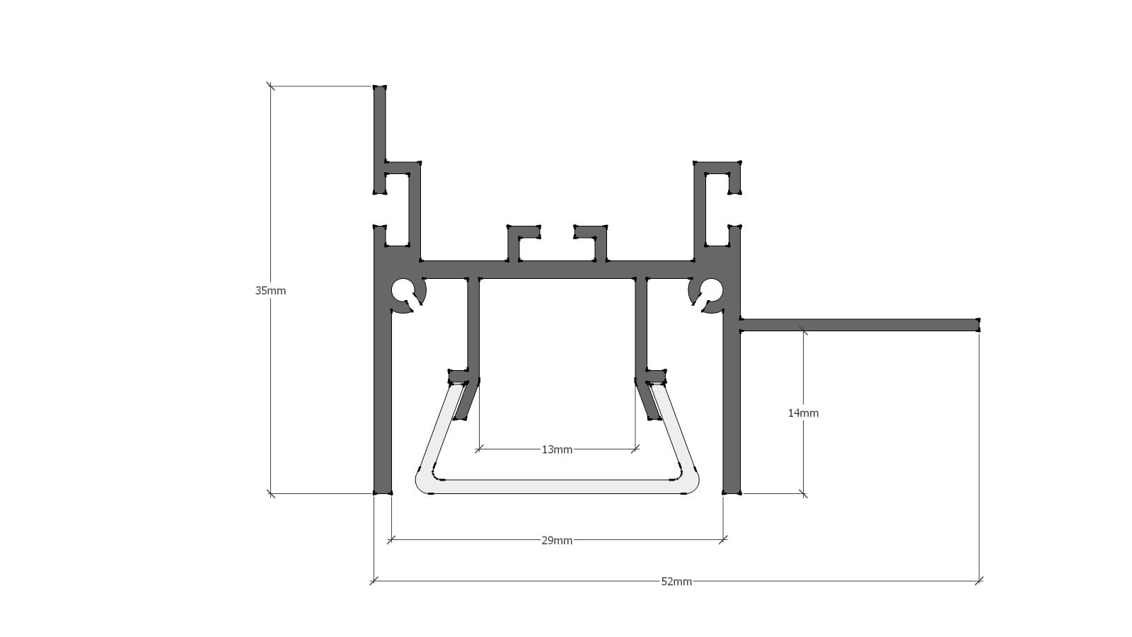 Цена указана за комплект. Алюминиевый анодированный профиль. Для лент шириной до 13мм. Размеры 2500х35х52мм. Вес 1650г. В комплекте с матовым рассеивателем. Используется для обеспечения контурной подсветки в инсталяциях с натяжными потолками.