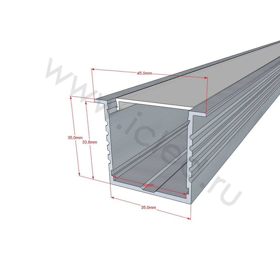 Цена указана за комплект. Алюминиевый анодированный профиль врезной. Для лент шириной до 30мм. Размеры 2000x45/35x35мм. Установочный размер 35х33,8мм. В комплекте с матовым рассеивателем.