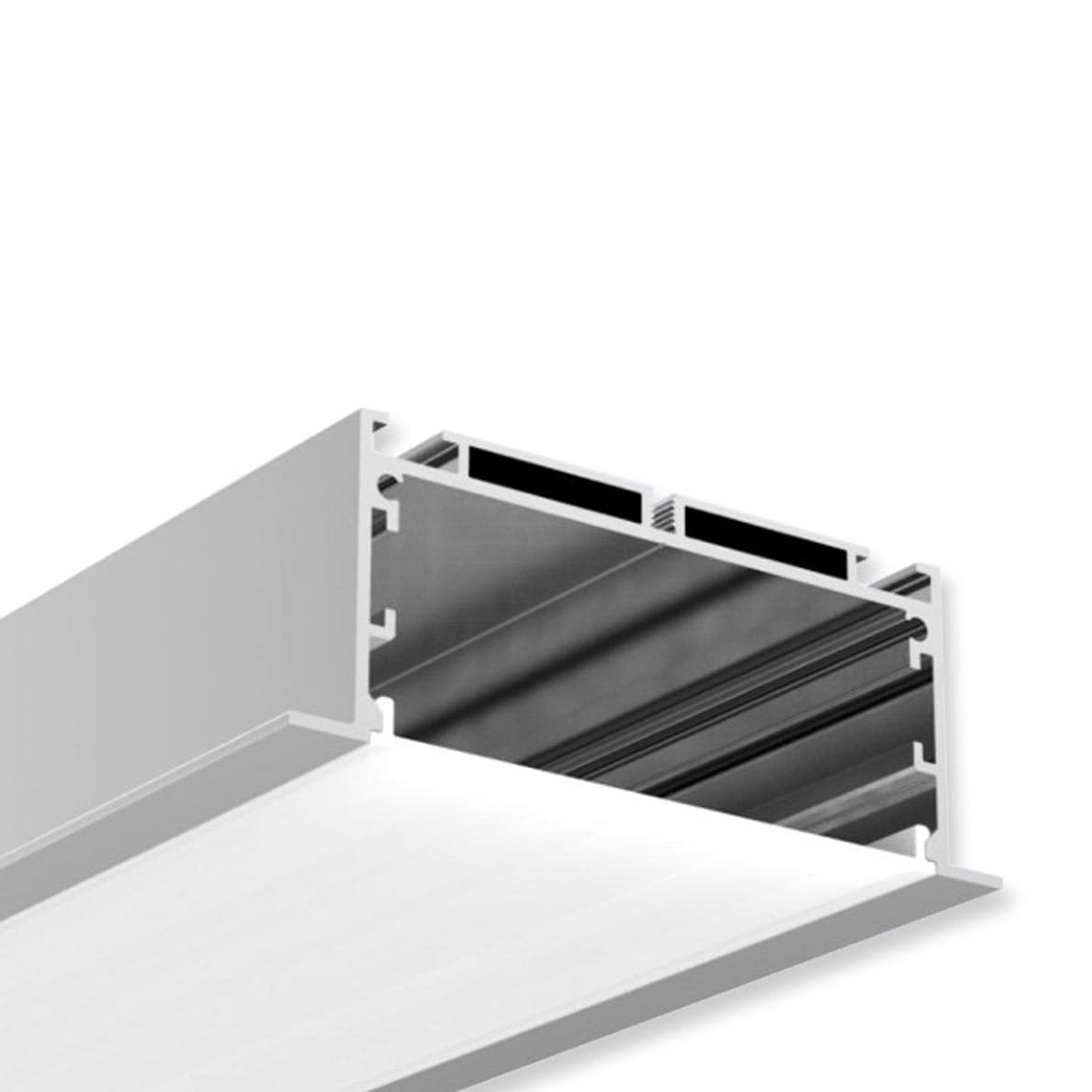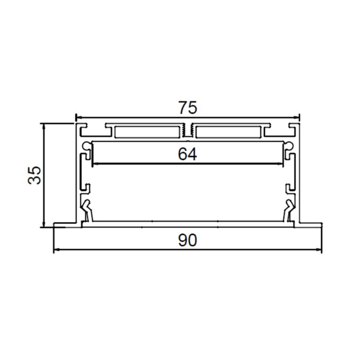 Цена указана за комплект. Алюминиевый анодированный врезной профиль . Для лент шириной до 64мм. Размеры 2500x90/75x35мм. В комплекте с матовым рассеивателем.
