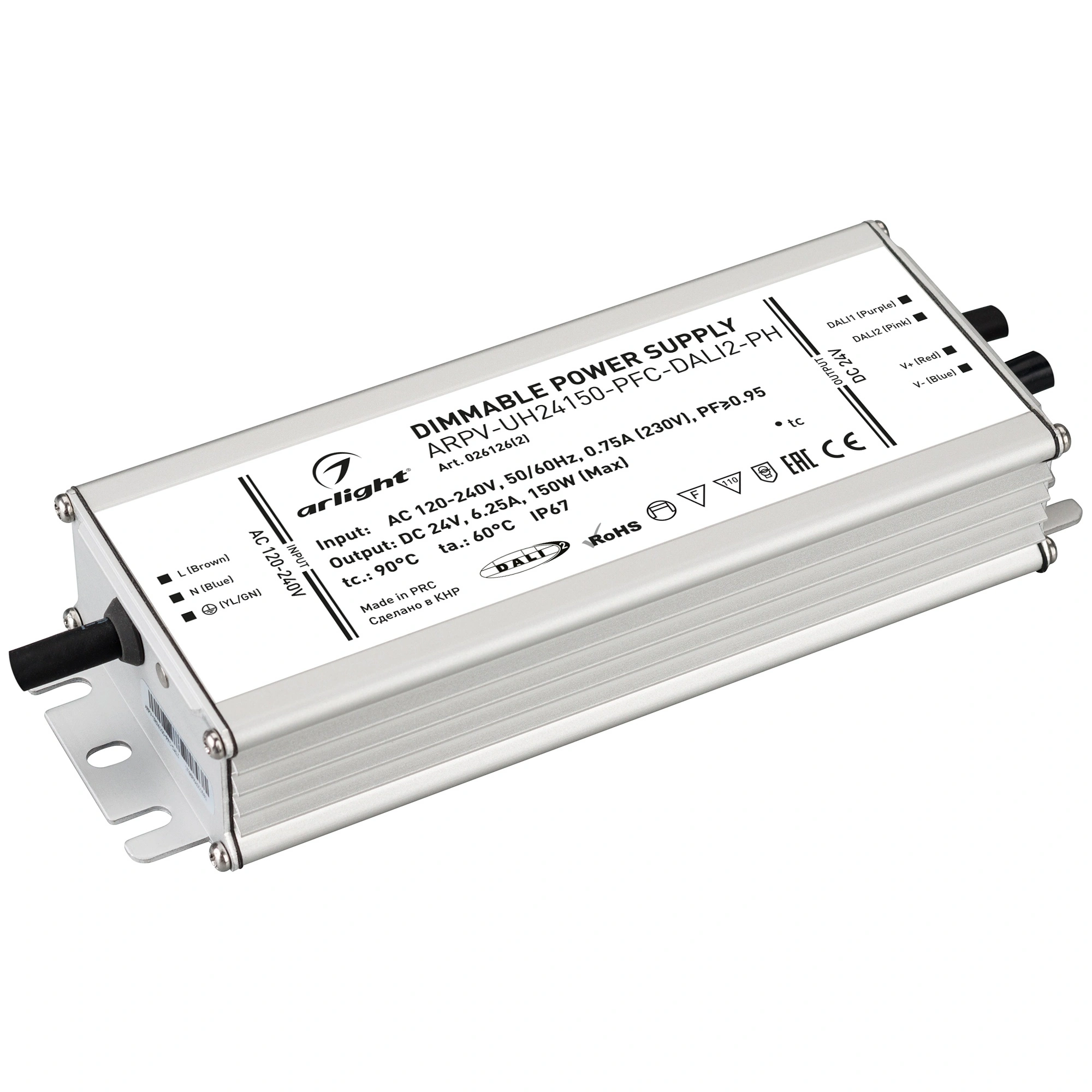 Диммируемый источник напряжения по протоколу DALI2.0 с гальванической развязкой для светодиодных изделий. Входное напряжение 120-240 VAC. Выходные параметры: 24 В, 6.3А, 150 Вт. Встроенный PFC >0.95. Герметичный алюминиевый корпус IP 67. Рабочая температура -40…+70C⁰. Габаритные размеры длина 188 мм, ширина 67.5 мм, высота 33.5 мм. Гарантийный срок 7 лет.