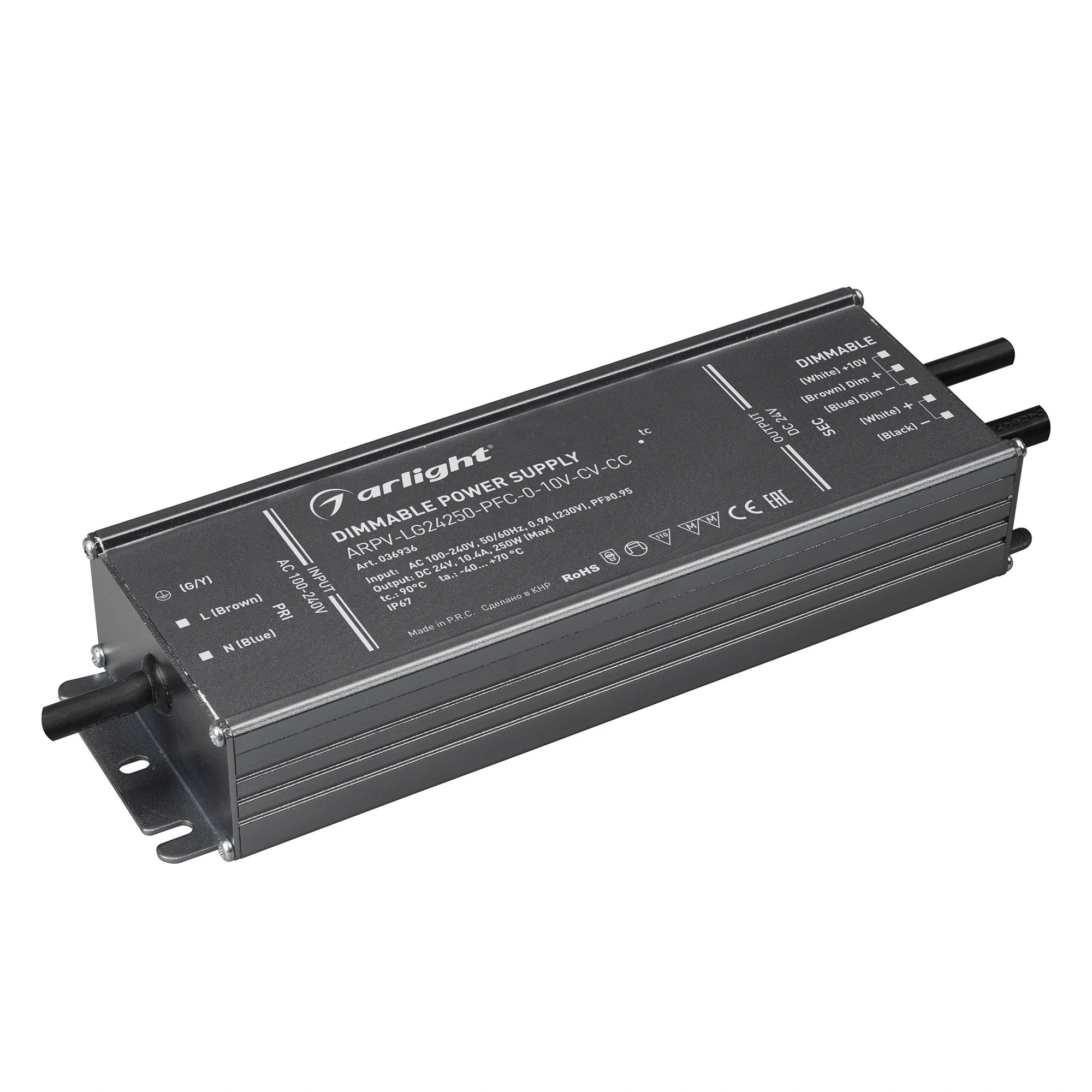 Диммируемый источник напряжения с переходом в режим источника тока по стандарту 1-10 В без полного гашения (также доступно диммирование с помощью резистора 10кОм) с гальванической развязкой для светодиодных изделий. Входное напряжение 100-240 VAC. Выходные параметры: 24 В (не ШИМ), 10,4А, 150 Вт. Встроенный PFC >0.95. Герметичный алюминиевый корпус IP 67. Рабочая температура -40…+70C⁰. Габаритные размеры длина 226 мм, ширина 74 мм, высота 38 мм. Гарантийный срок 5 лет.