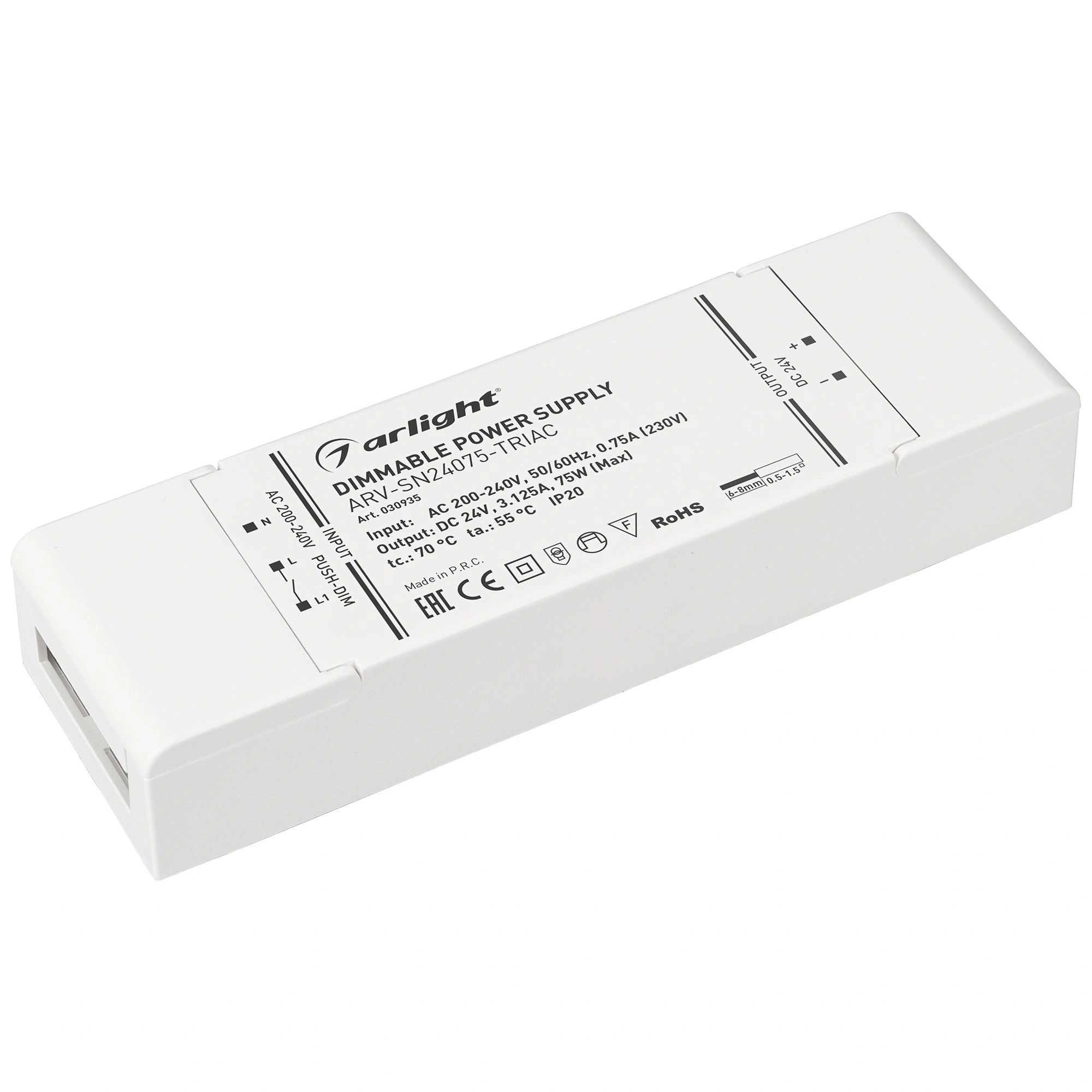 Блок питания 24V с гальванической развязкой, ток 3,125А, 75 Вт, с управлением от симисторного настенного диммера (TRIAC) и/или с помощью функции Push-dim, без корректора мощности, PF>0,5. Рекомендуется для использования с настенными диммерами типа RL (резистивная нагрузка, Leading edge). Пластиковый корпус IP20. Вход: 200-240VAC. Выход: 24VDC 3.125A. Размер 179х56х30 mm. Гарантия 3 года.