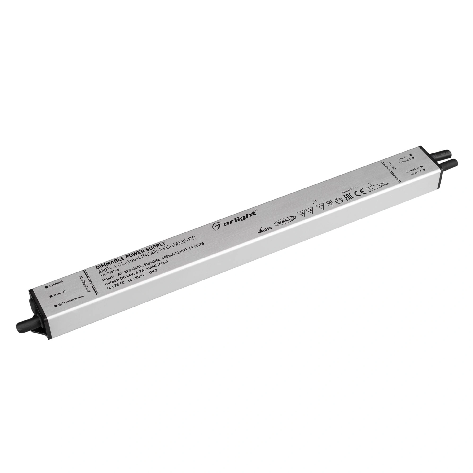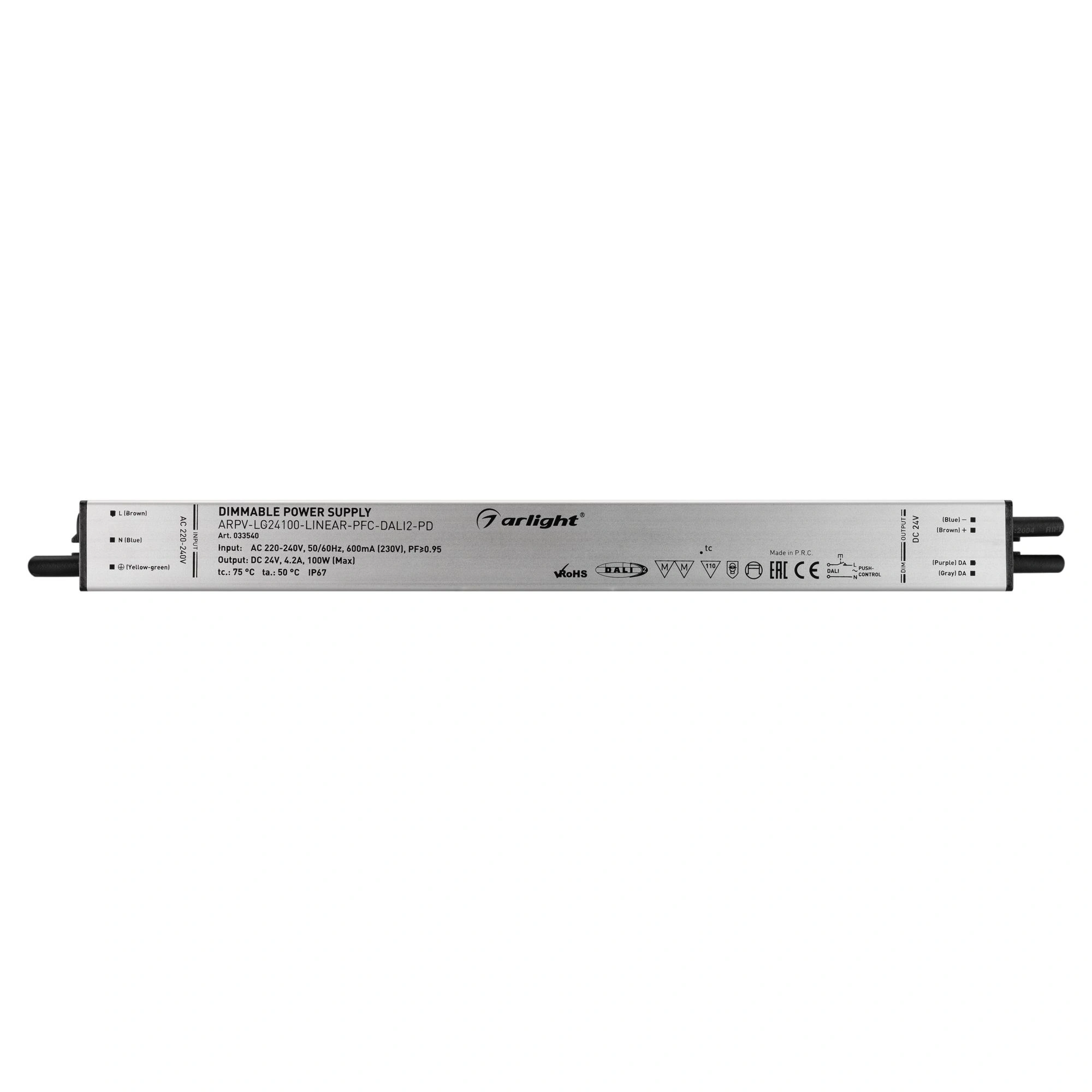 Диммируемый блок питания 24V с гальванической развязкой, ток 4.2А, 100Вт, с управлением DALI, c функцией PUSH-DIM, с корректором мощности, PF>0,95. Тонкий металлический корпус IP67. Вход: 220-240VAC. Выход: 24VDC, ШИМ 1кГц. Размер 320*30*21 mm.. Совместимость со стандартом EMC. Гарантия 5 лет.