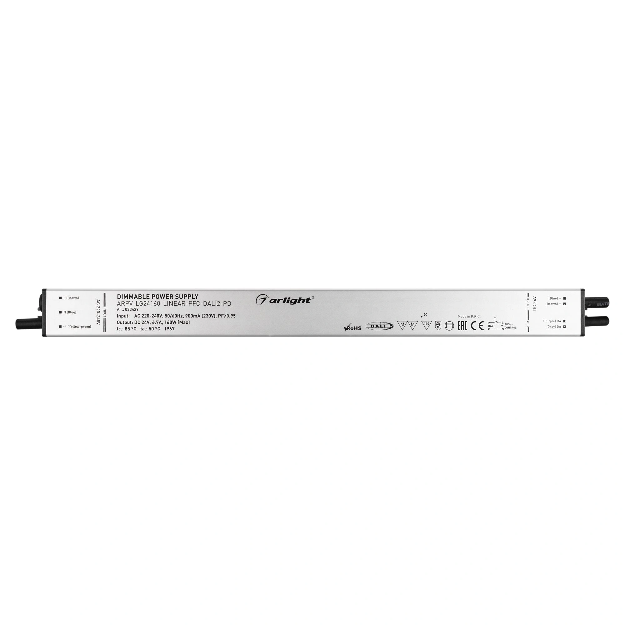 Диммируемый блок питания 24V с гальванической развязкой, ток 6.7А, 160Вт, с управлением DALI, c функцией PUSH-DIM, с корректором мощности, PF>0,95. Тонкий металлический корпус IP67. Вход: 220-240VAC. Выход: 24VDC, ШИМ 1кГц. Размер 350х30х21 mm.. Совместимость со стандартом EMC. Гарантия 5 лет.