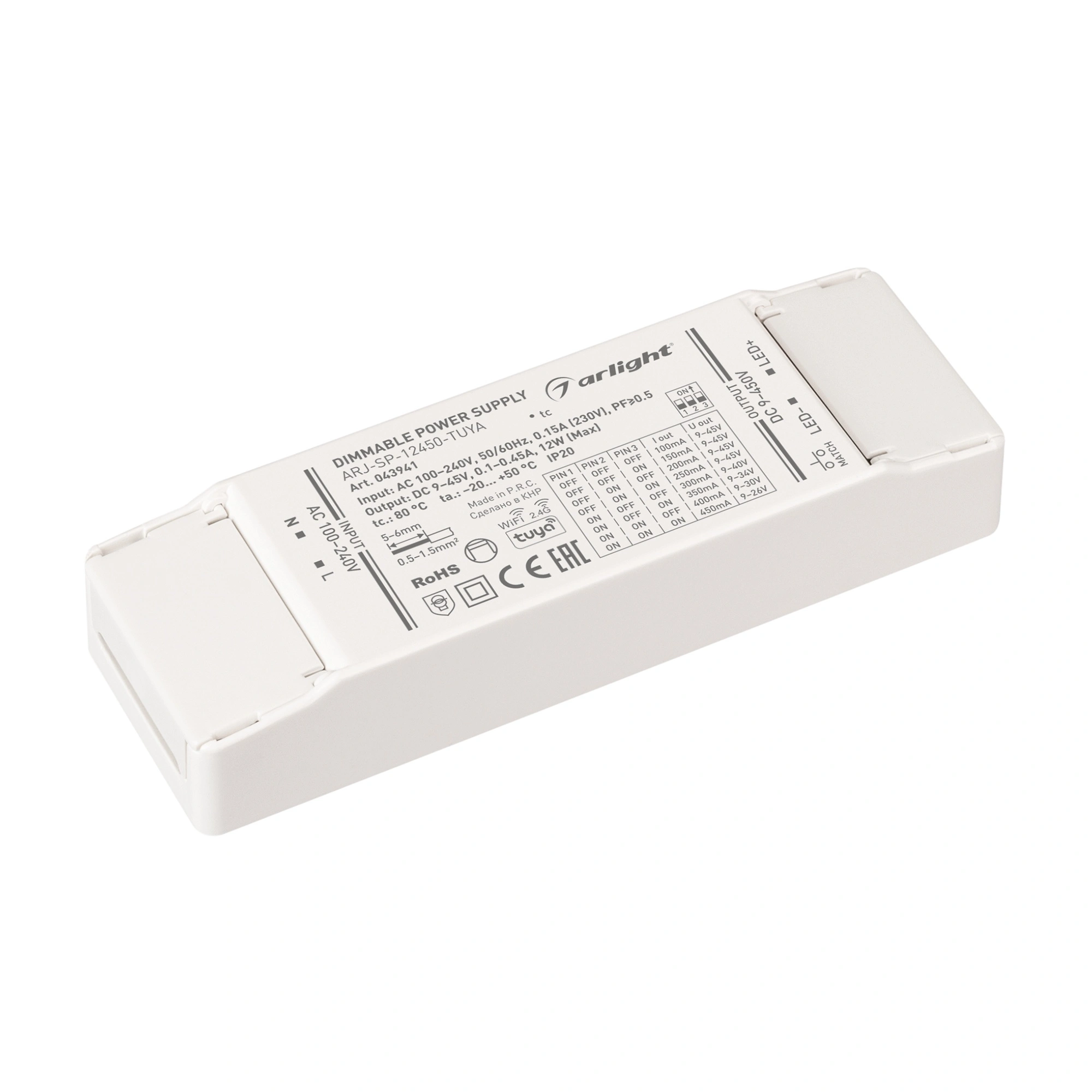 Диммируемый источник тока одноканальный, для светодиодных светильников. Выбор значения выходного тока осуществляется подстроечным резистором на плате. Входное напряжение 220-240 VAC. Выходные параметры: 9-45В (100мА), 9-45В (150мА), 9-45В (200мА), 9-45В (250мА), 9-40В (300мА), 9-34В (350мА), 9-30В (400мА), 9-26В (450мА), максимальная мощность 12 Вт. Встроенный PFC >0,5. Защита от КЗ на выходе, перегрузки, перегрева. Управление через WI-FI 2.4ГГц. Совместим с платформой TUYA, АЛИСА от ЯНДЕКС. Управление со смартфона через приложение SmartLife, с помощью пультов серии SMART. Размеры 111х36х20 мм.
