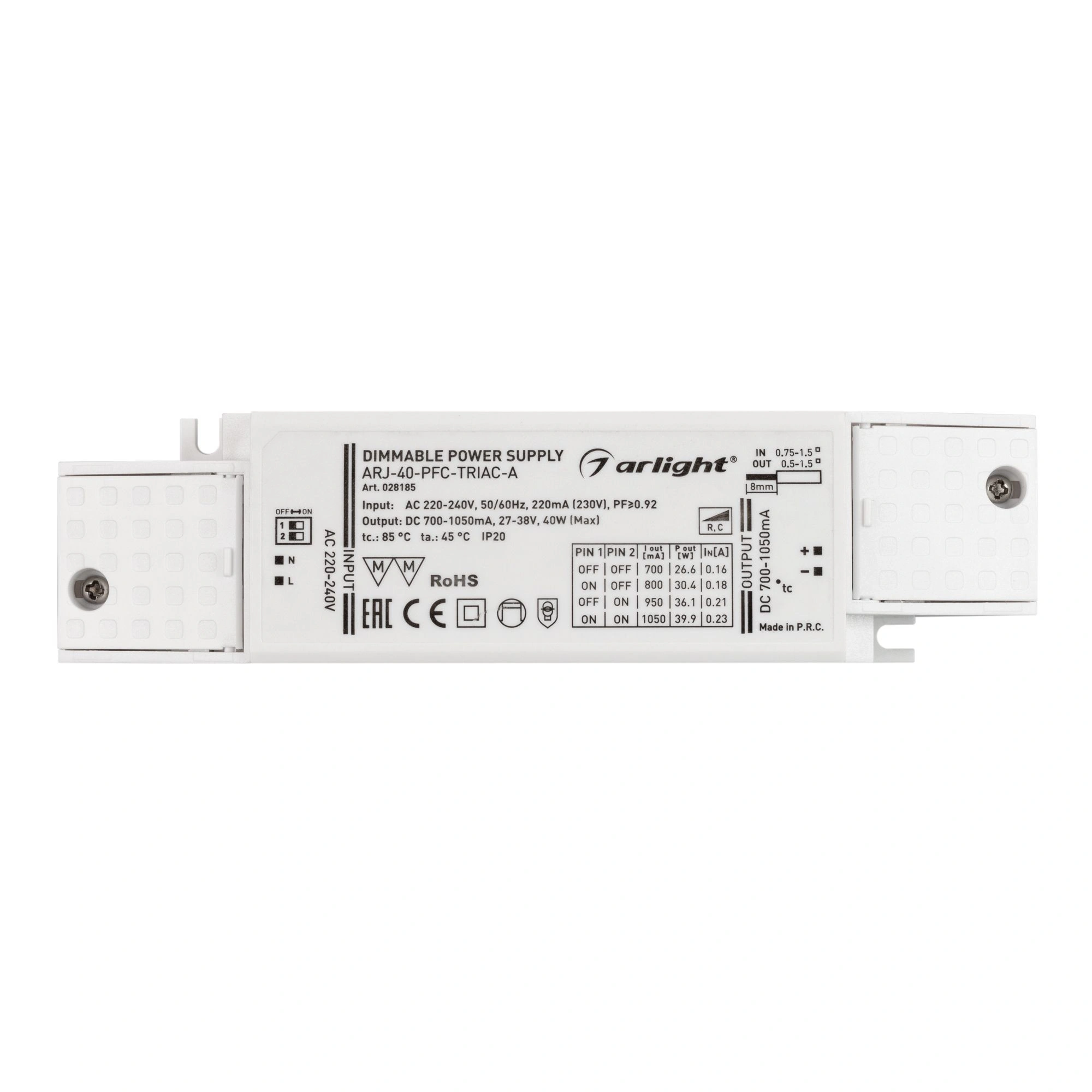Диммируемый источник тока по стандарту TRIAC с гальванической развязкой для светильников и мощных светодиодов. Входное напряжение 220-240 VAC. Выходные параметры: 27-38 В, 700-1050 mА, 40 Вт. Выбор значения тока осуществляется DIP-переключателем. Встроенный PFC >0,92. Негерметичный пластиковый корпус IP 20. Габаритные размеры длина 172 мм, ширина 44 мм, высота 30 мм. Гарантийный срок 5 лет.